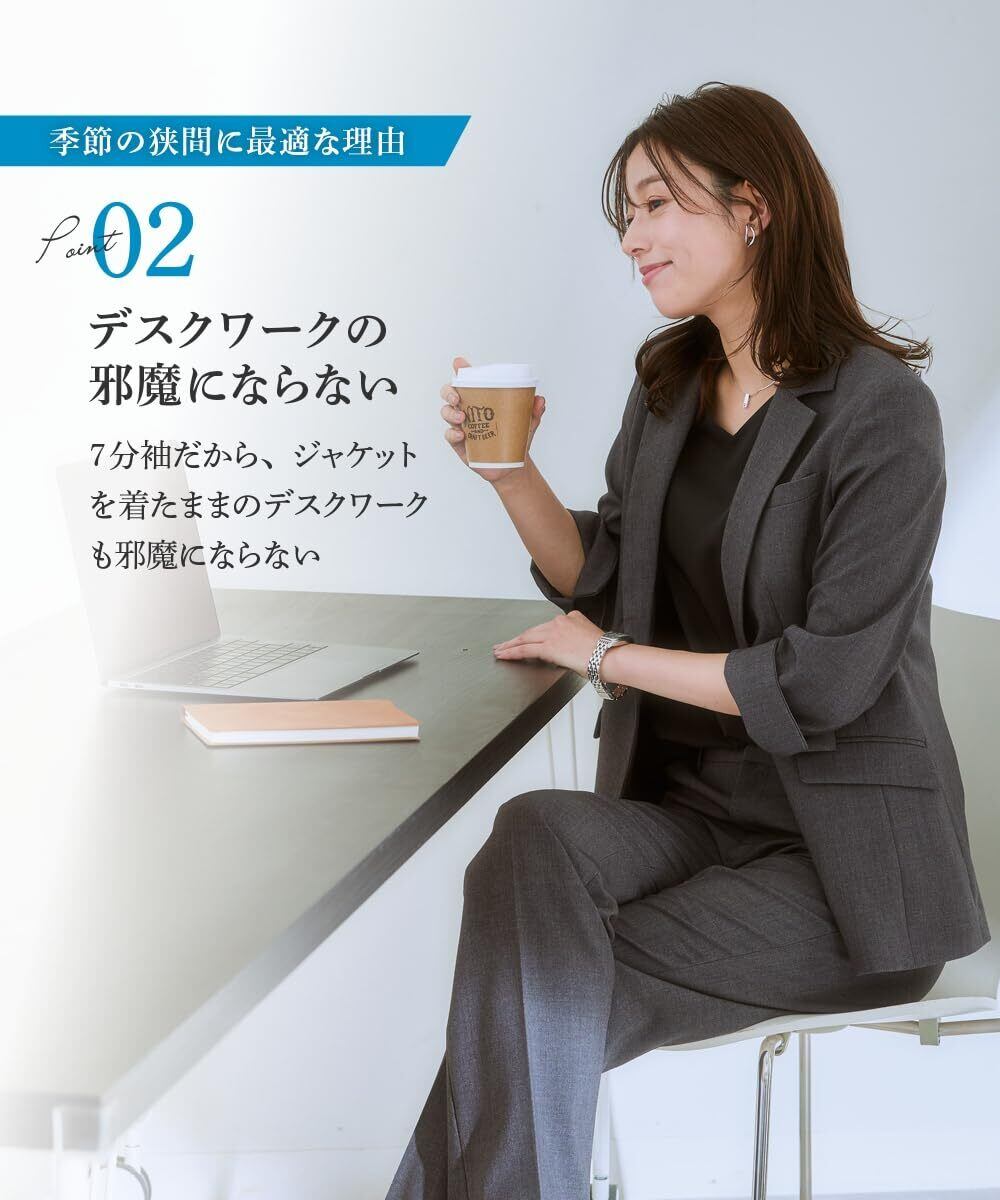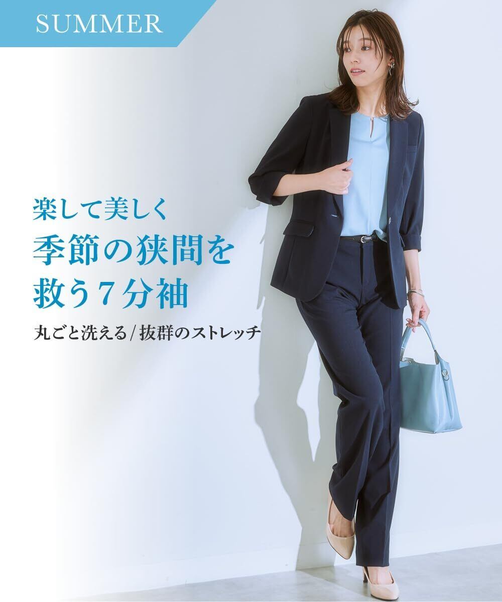 ベーシックなパンツスーツの七分袖ジャケットタイプ!!スーツ通勤の着回しバリエにオススメ!1着は持っていたい定番シルエットのパンツスーツ!