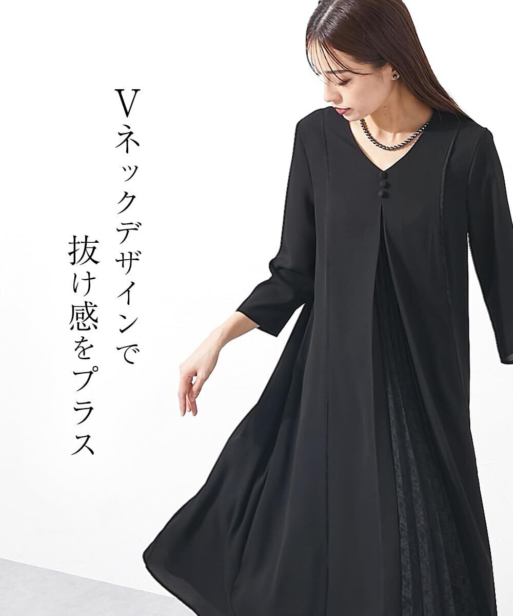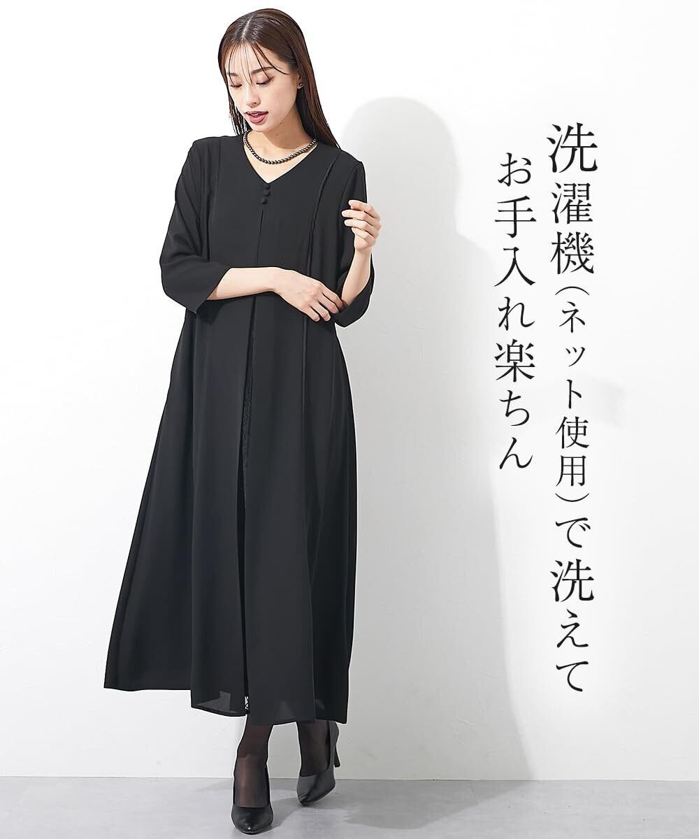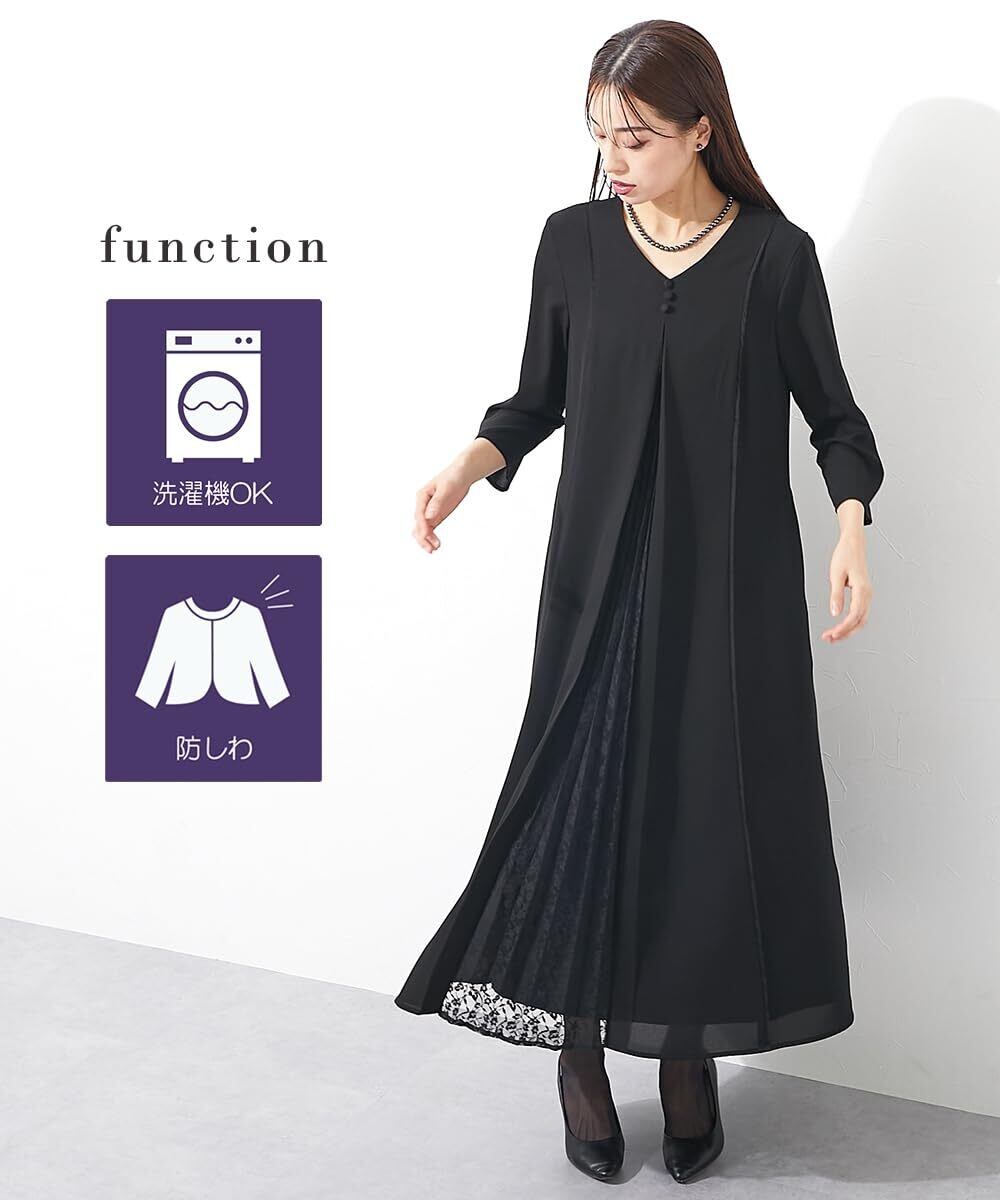 [ニッセン] ブラックフォーマル レディース 【喪服・礼服】 日本製生地使用 洗える防しわフロントレースプリーツ切替Vネックデザインロング丈ワンピース 大きいサイズ有 〔Callarus〕