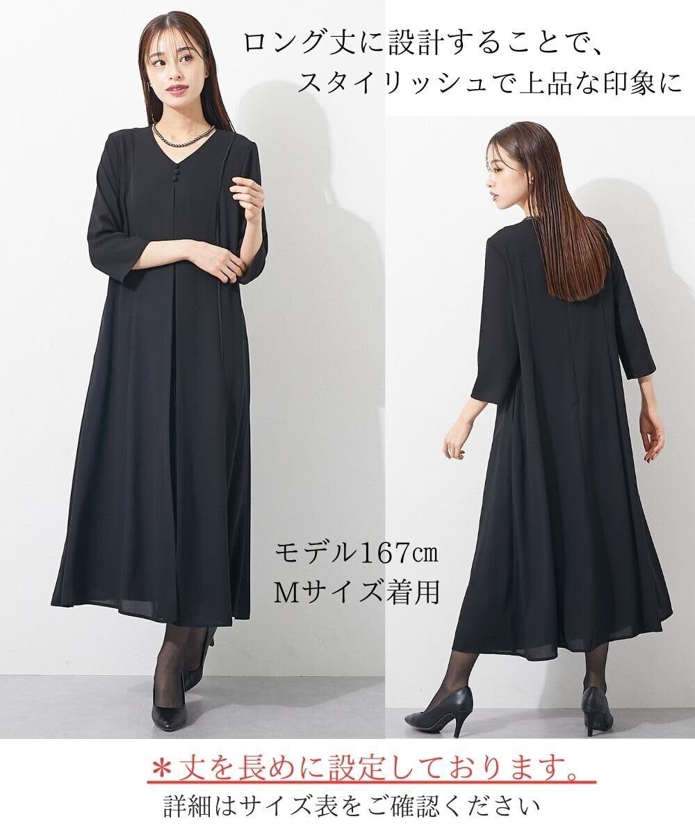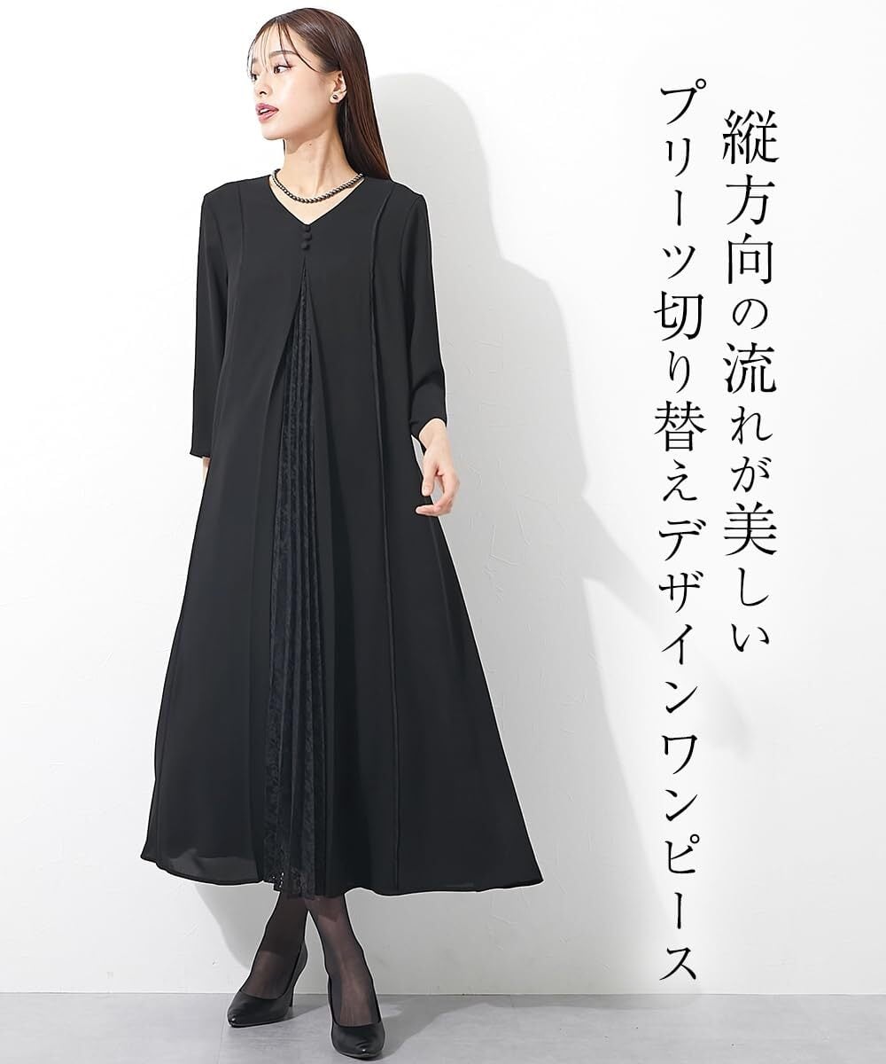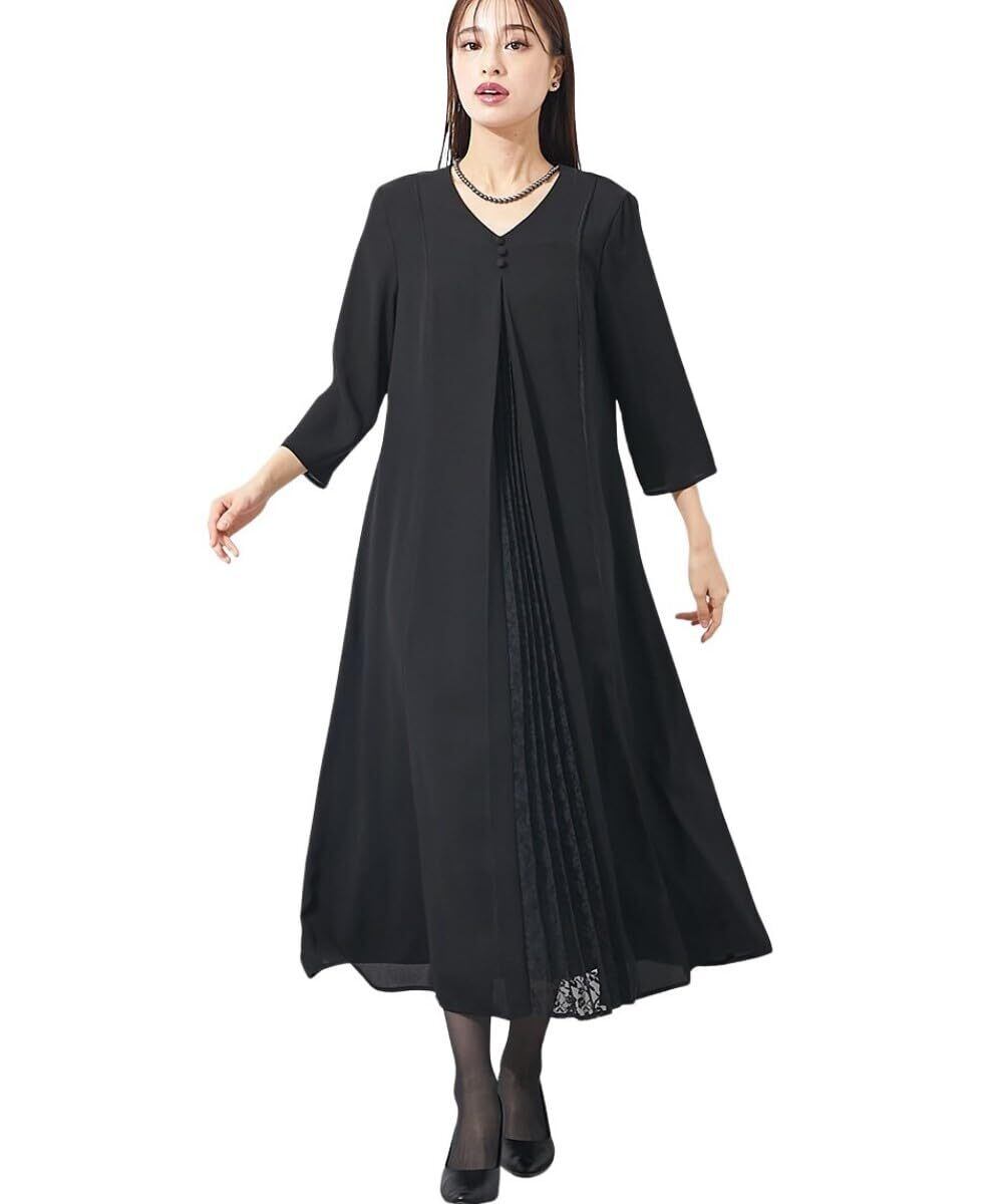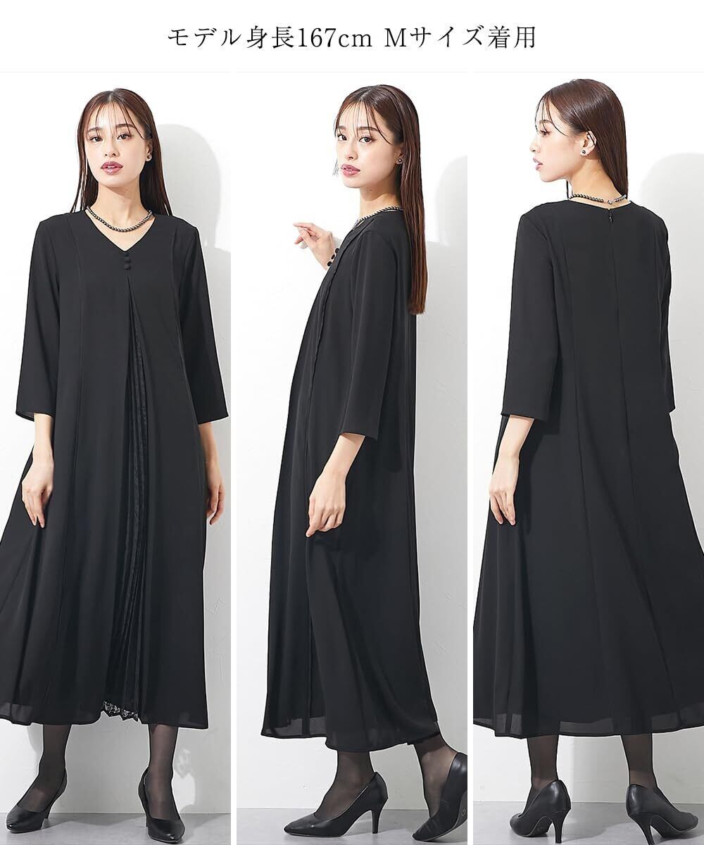 [ニッセン] ブラックフォーマル レディース 【喪服・礼服】 日本製生地使用 洗える防しわフロントレースプリーツ切替Vネックデザインロング丈ワンピース 大きいサイズ有 〔Callarus〕