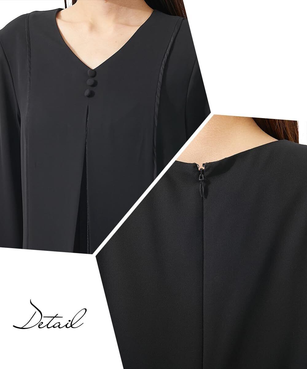 Vネックデザインが、ブラックフォーマルに抜け感を演出し、重すぎない印象を与えます。防しわなので、しわになりにくい。
