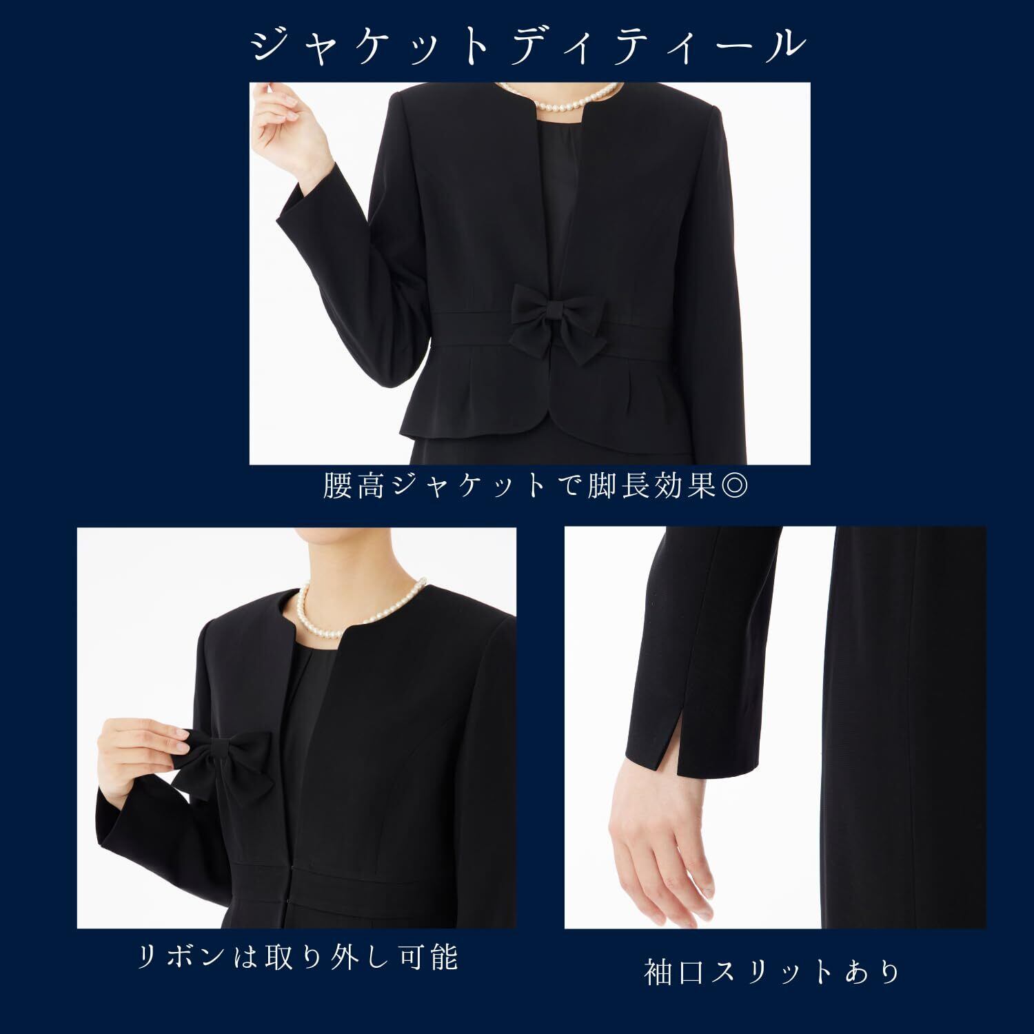 【商品特徴】厳選した素材を使用し、葬儀や通夜、法事などさまざまなシーンでご利用いただける商品です。こちらは、ジャケットとワンピースのアンサンブルセットです。ノーカラーペプラムジャケットは、腰の位置を高く見せ、脚長効果があります。リボンは取り外し可能で、袖口にはスリットがあり、便利な内ポケットも付いています。ワンピースにはシフォンジョーゼットを使用しており、夏のフォーマルな場面にも最適です。やや高めのウエストデザインで、スタイルアップが期待できます。後ろファスナー仕様でデザイン性を重視し、7分袖とフレアー切り替えで腕を細く見せる効果があります。また、ご自宅で簡単に洗濯できるため、お手入れも便利です。ストレッチ素材で、快適な着心地を実現しています。