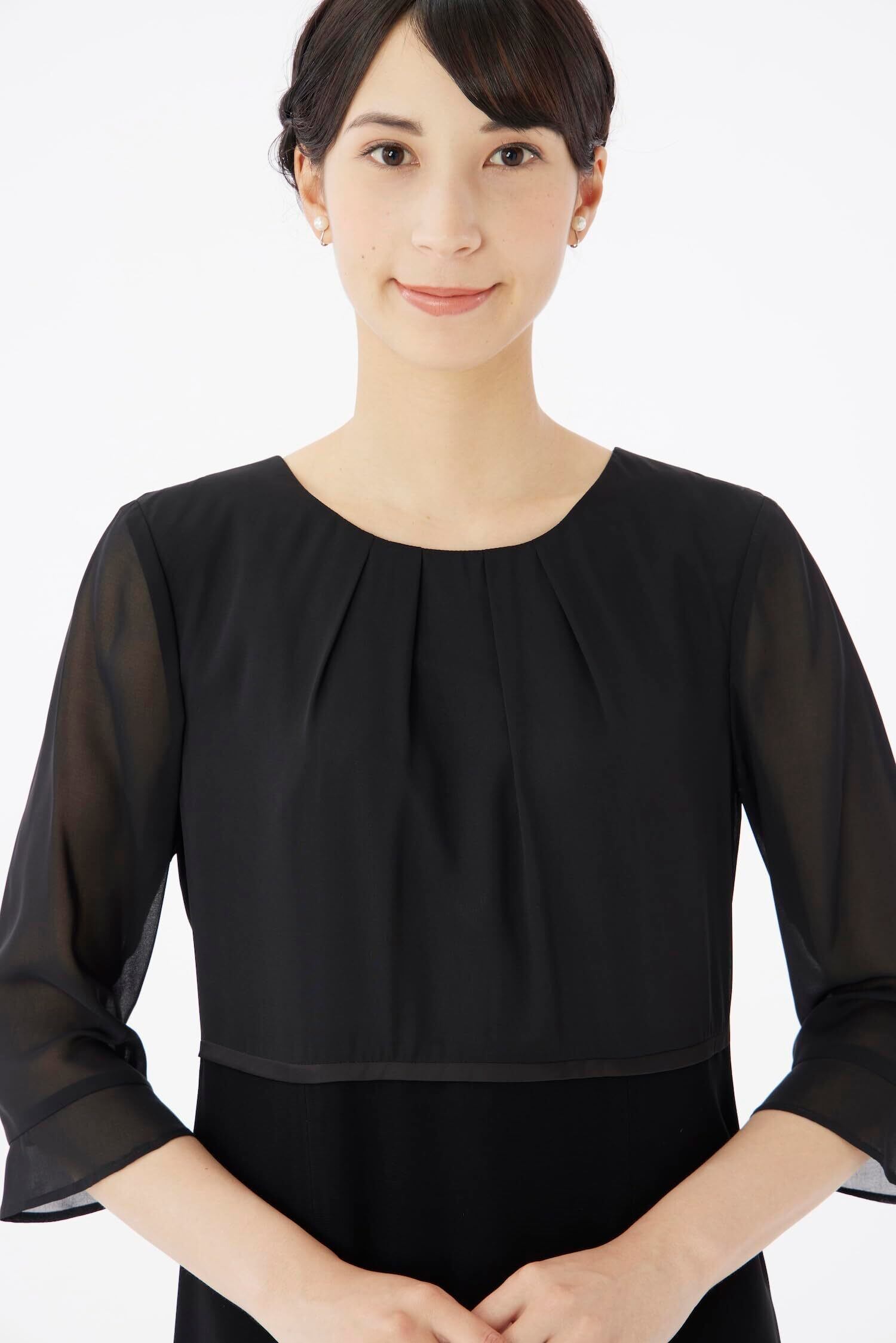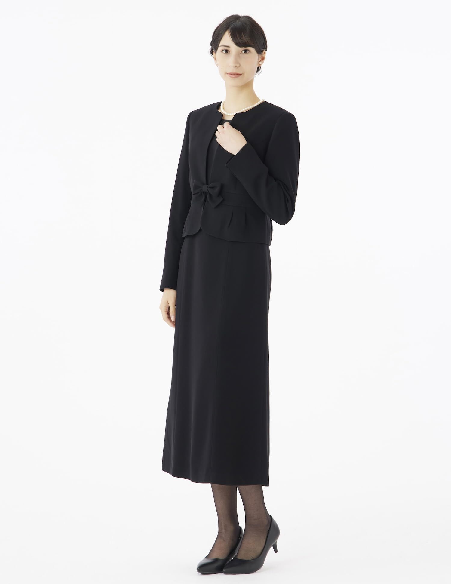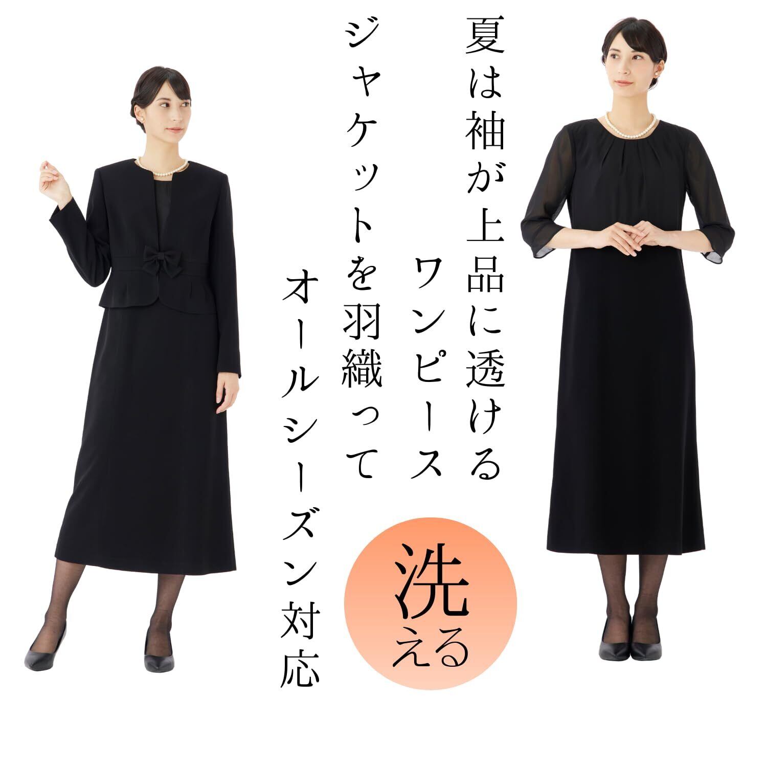 【商品特徴】厳選した素材を使用し、葬儀や通夜、法事などさまざまなシーンでご利用いただける商品です。こちらは、ジャケットとワンピースのアンサンブルセットです。ノーカラーペプラムジャケットは、腰の位置を高く見せ、脚長効果があります。リボンは取り外し可能で、袖口にはスリットがあり、便利な内ポケットも付いています。ワンピースにはシフォンジョーゼットを使用しており、夏のフォーマルな場面にも最適です。やや高めのウエストデザインで、スタイルアップが期待できます。後ろファスナー仕様でデザイン性を重視し、7分袖とフレアー切り替えで腕を細く見せる効果があります。また、ご自宅で簡単に洗濯できるため、お手入れも便利です。ストレッチ素材で、快適な着心地を実現しています。 【着用シーン】このアンサンブルは、葬儀、告別式、通夜、一周忌などの厳粛な場面から、弔問、法事、そして卒園式、卒業式などの晴れ舞台まで幅広く対応します。 【サイズ】 バスト、ウエスト、ヒップなどは商品の仕上がり寸法です。ヌードバスト、ヌードウエスト、ヌードヒップは肌着1枚を着用した際のおおよそのサイズを示しております。実際のサイズは商品の仕上がり寸法をご確認ください。 【ご利用シーズン】 春夏秋冬を通してご利用いただけます。
