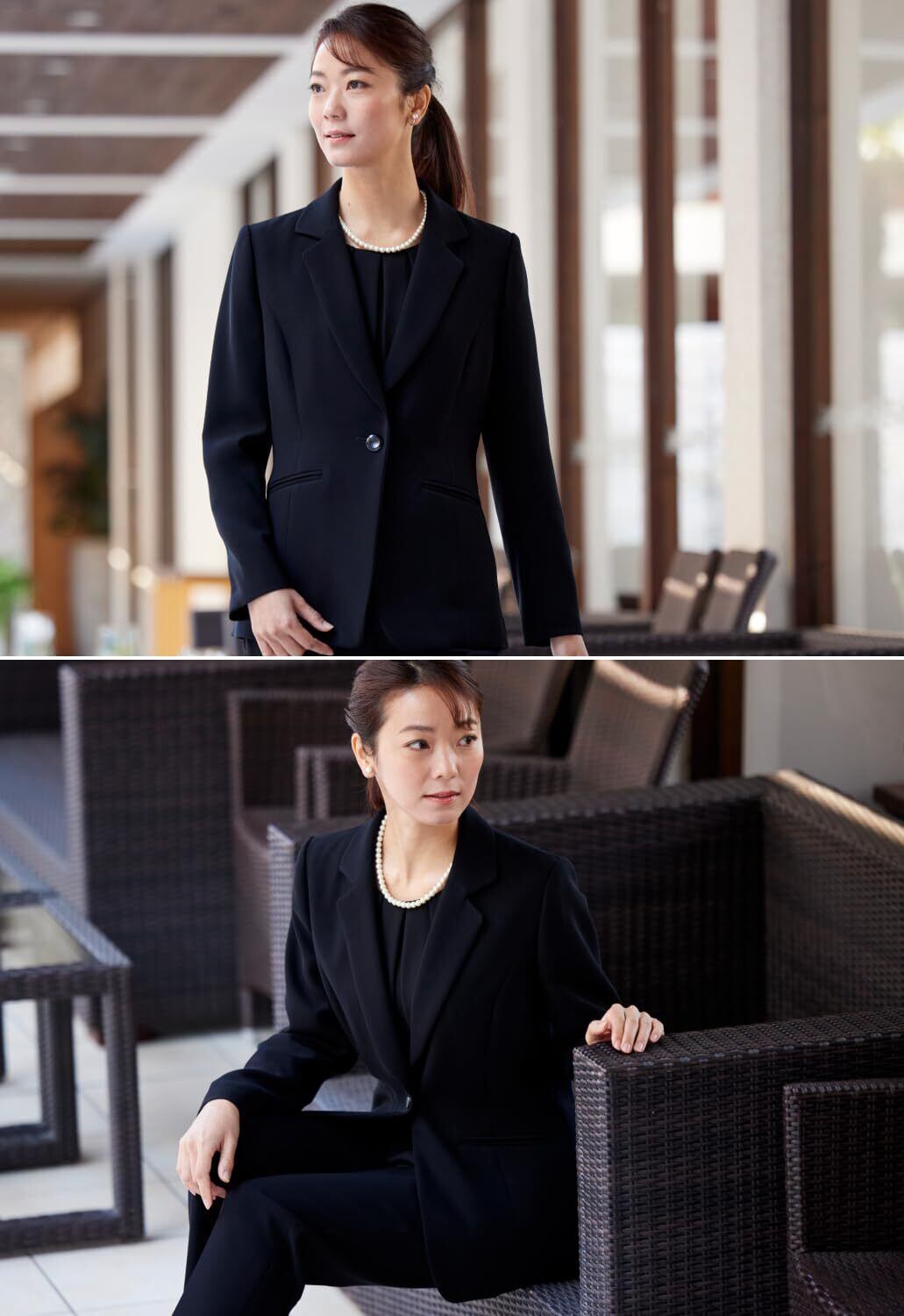 【高級感のあるデザイン】 ジャケットの衿が丸みを帯びており、堅苦しくなりすぎず女性らしい優しい印象に。