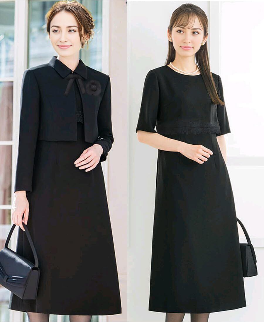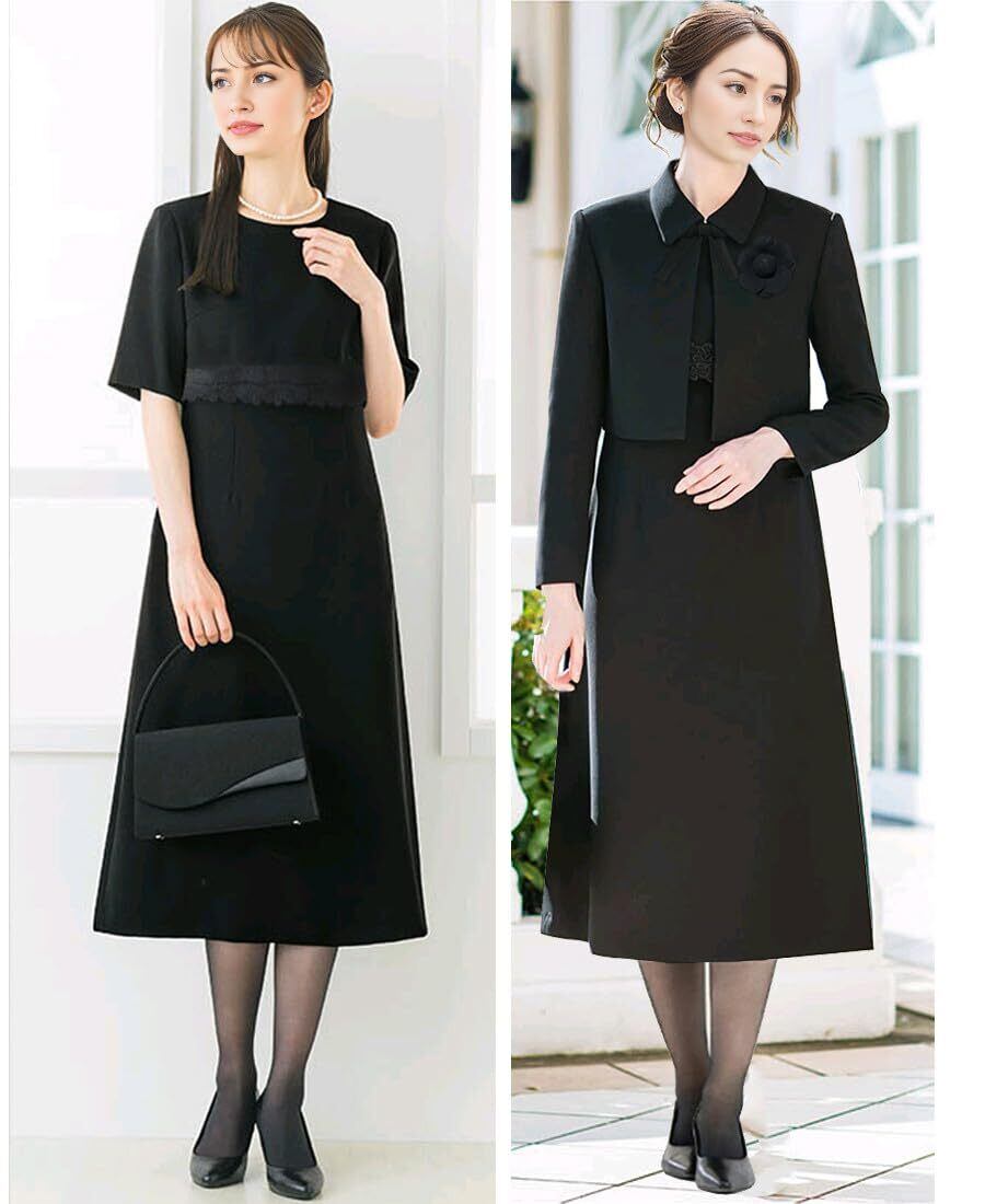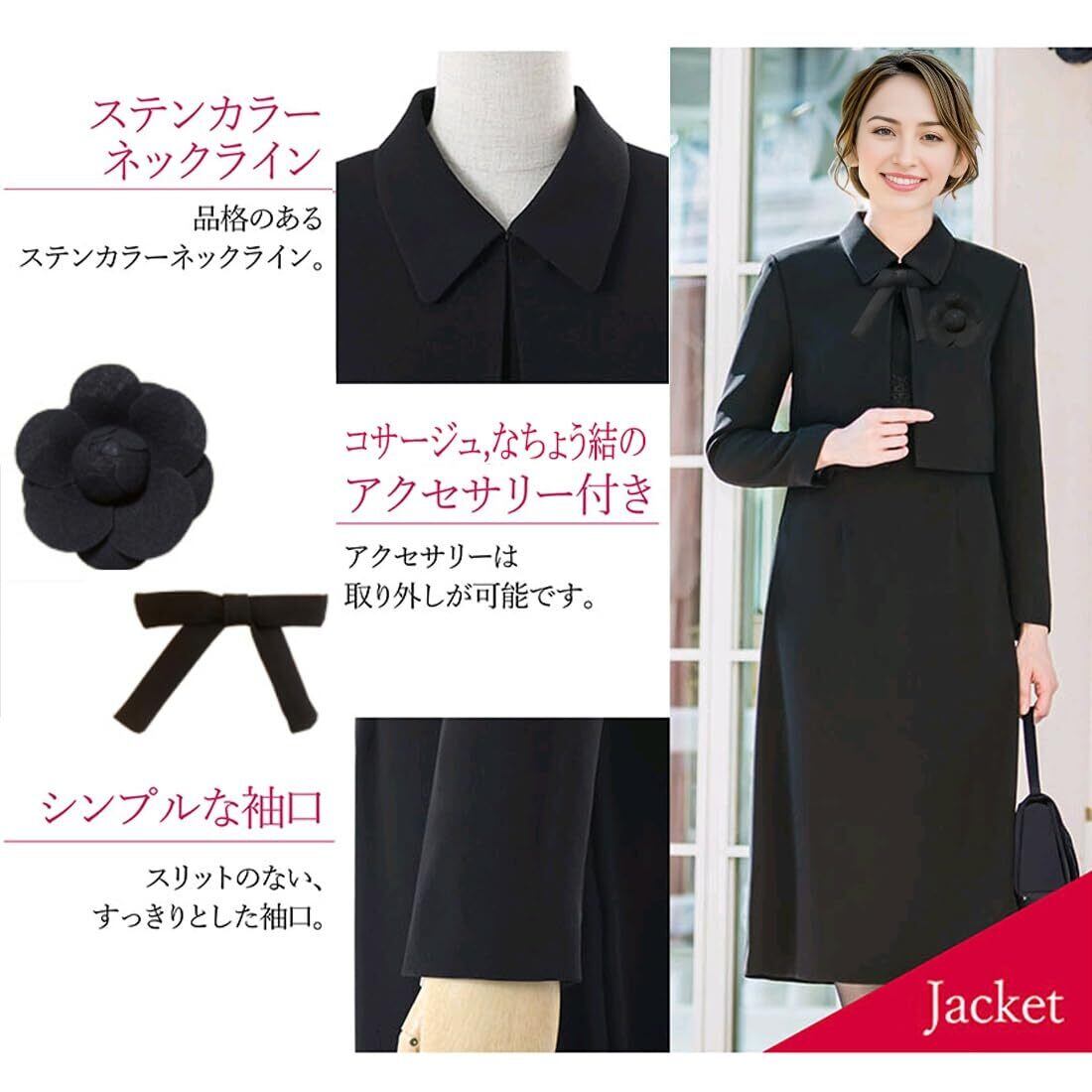 【セット内容】—— ジャケット・ワンピース。黒の深さを引き立たせる特別な技術「濃染加工」を施し、深みのある黒を表現しています。何度も黒を重ねて染めたような黒色はお客様の悲しみを心から表します。さらに着席や移動の機会が多いお悔やみの場でもしわになりにくい素材を選定していますので、葬儀の場でも安心して着用頂けます。