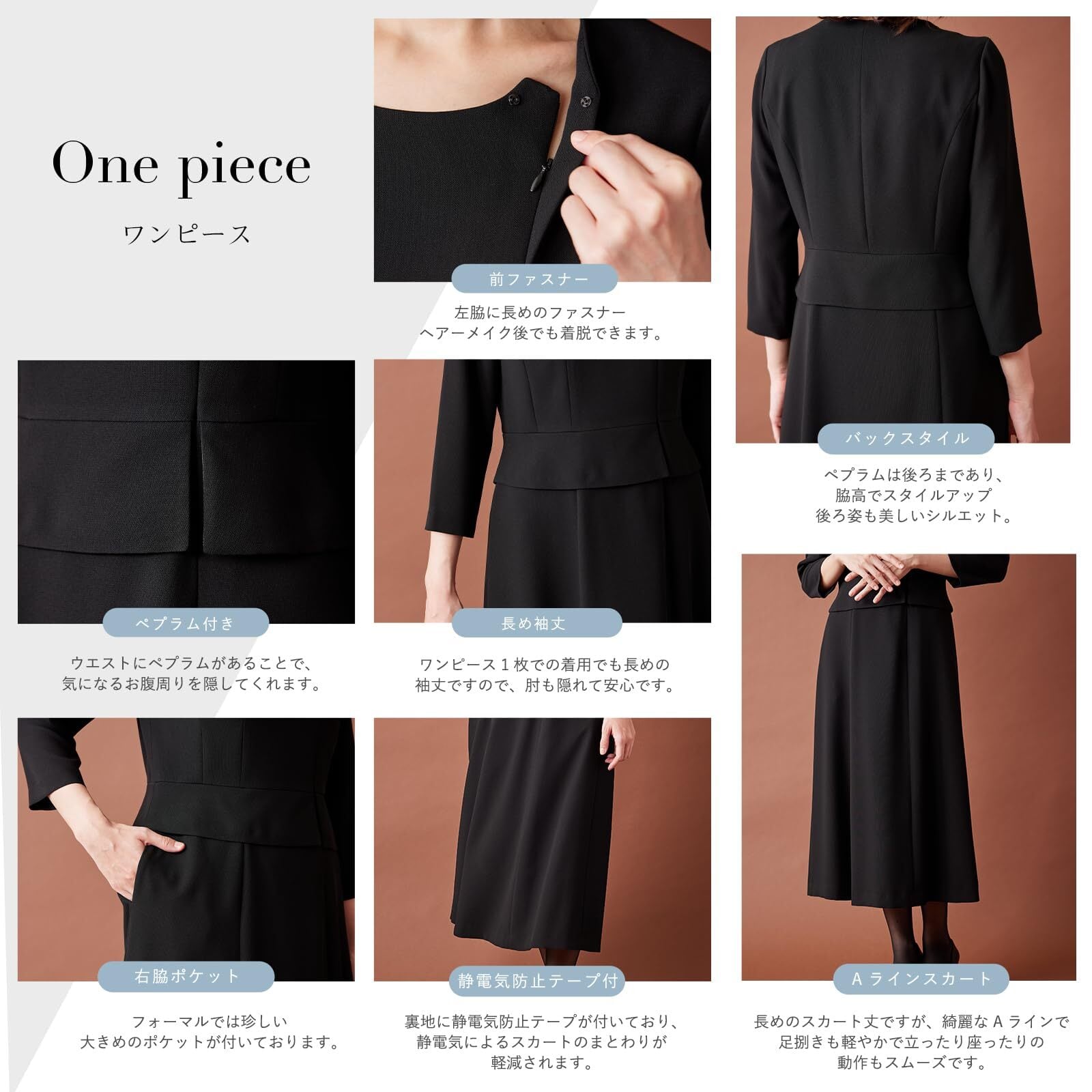 【製品仕様】フォーマルにふさわしい「濃染加工」生地を使用 / ご家庭の洗濯機洗い対応 / スカートの裏地に静電気防止テープ付き