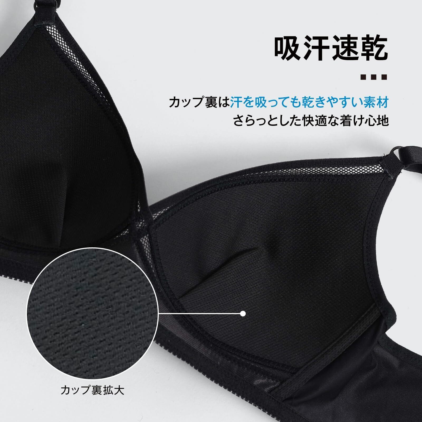・カップの生地が薄く、非常に軽いので快適な着用感。カップ裏の素材は吸汗速乾素材を使用。洗濯をしても型崩れしにくい