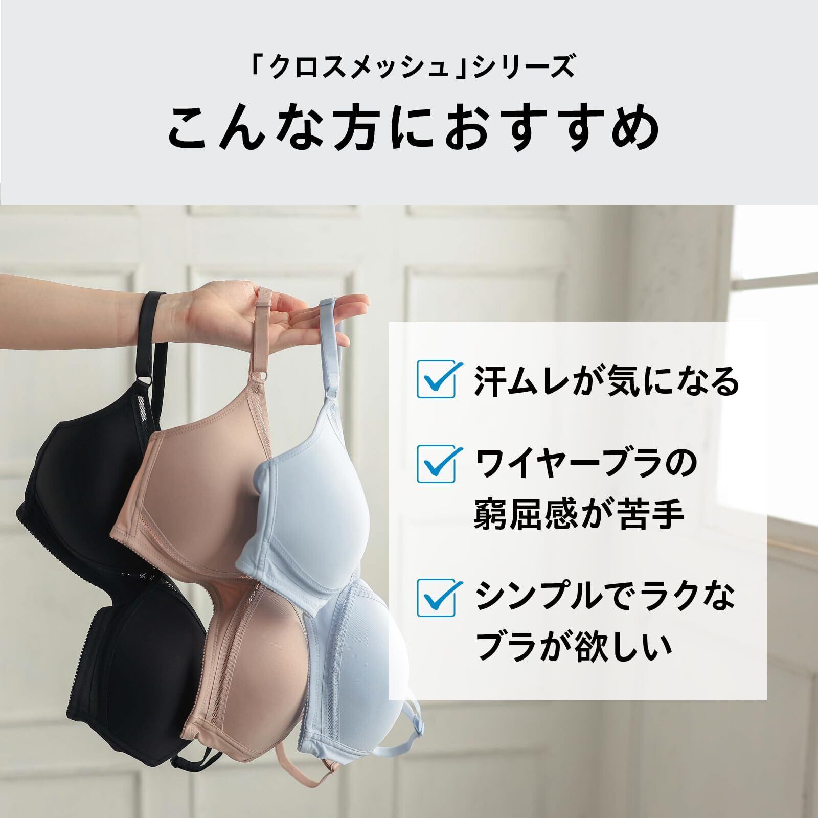 【クロスメッシュブラ】 カップの周りはクロスになったメッシュテープ仕様で、通気性が良く、ムレにくい。さらりとした着心地ラクなノンワイヤーブラです。