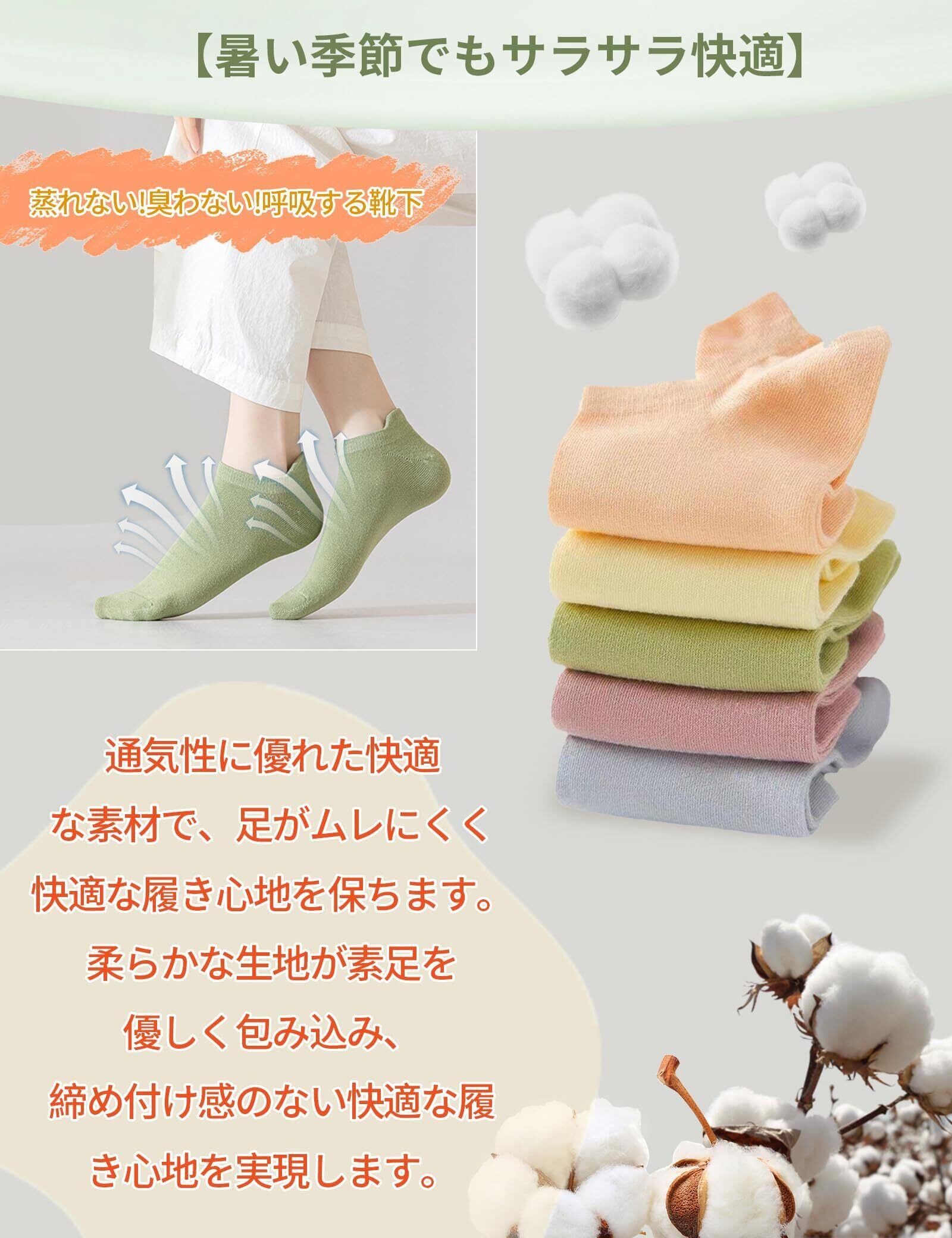 【コットン配合・通気性 くるぶしソックス】綿とナイロンのバランス配合で作られたこのくるぶしソックスは、吸汗速乾性と防臭抗菌機能を備え、一日中サラサラな履き心地です。通気性に優れた素材で、春夏の蒸れを防ぐレディースサマーソックスとして最適。フラット縫いで通気性良く、柔らかく高密度、縮みにくい・変形しない・耐久性ありの特徴を持ちます。蒸れない靴下として、季節を問わず活躍!