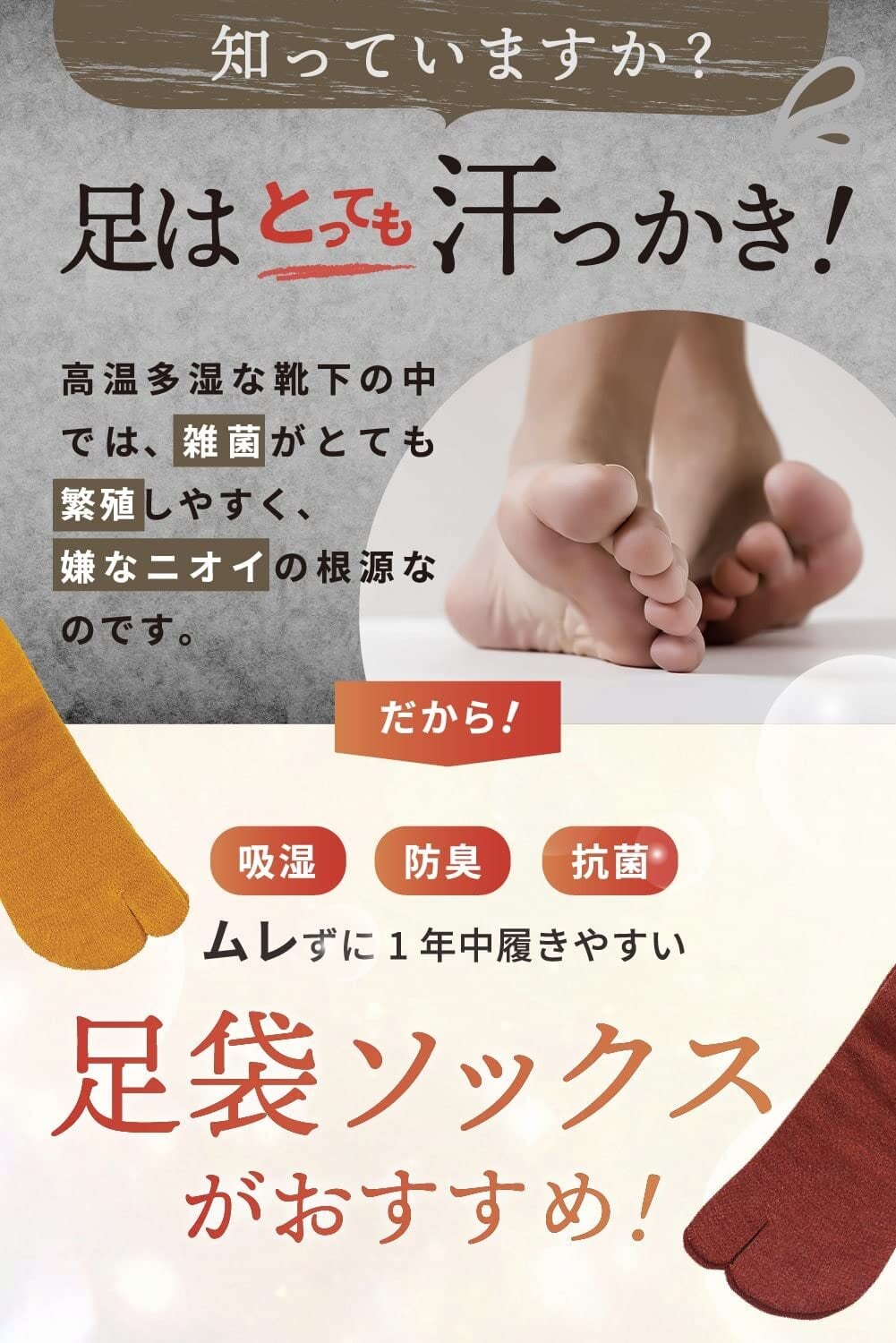 【ムレない・脱げない】 汗をかいても吸収してくれるので快適さはもちろん、汗による指の間の冷え対策にも 。足の間の汗をしっかり吸収するのでムレ防止&ニオイ防止で靴の中はいつでもさらさら