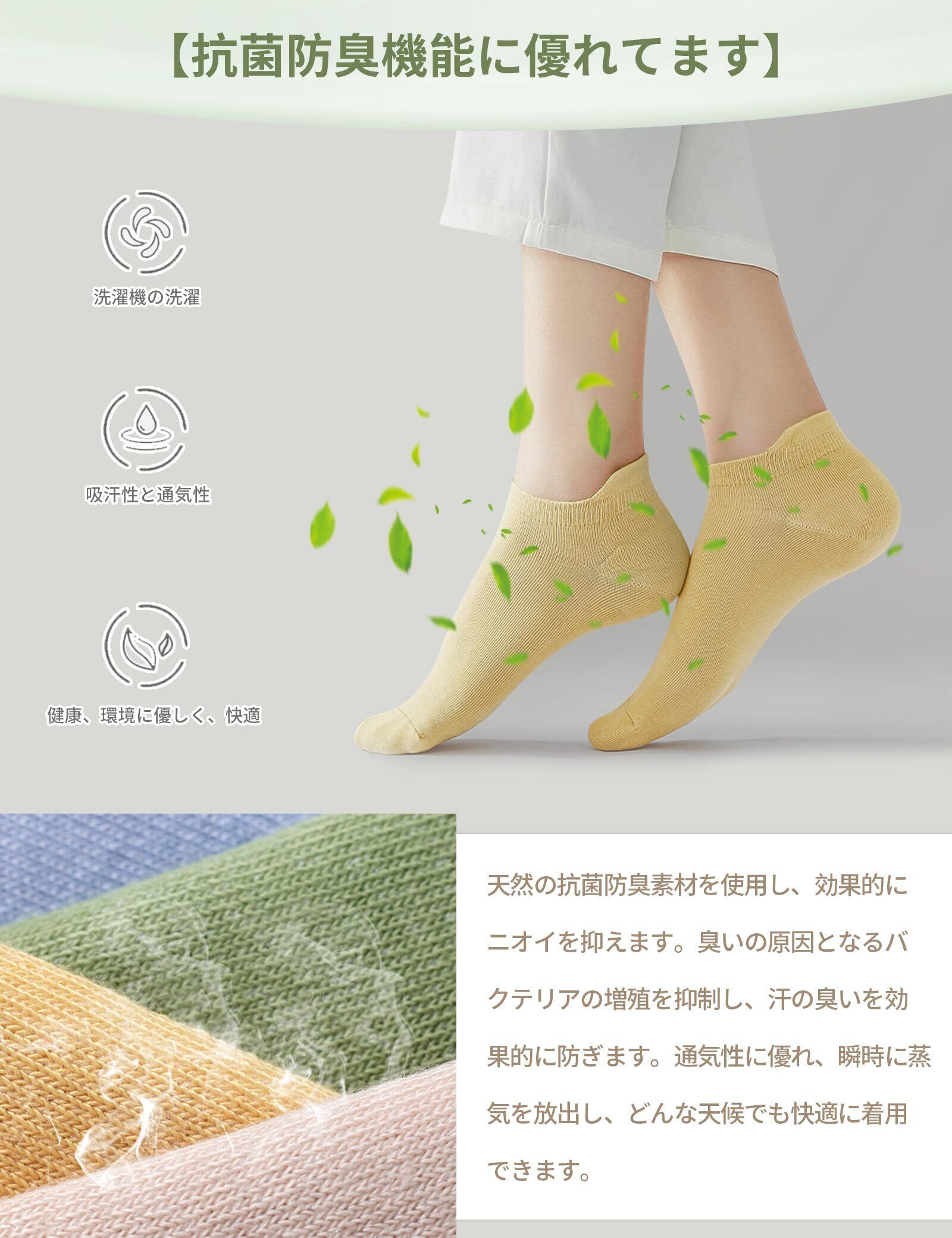 【綿混通気性・抗菌防臭 ソックス レディース】綿とポリエステルの繊細な混合素材で作られたこの足首用ソックスは、吸汗速乾性、抗菌性、防臭性を備え、一日中快適な履き心地です。 通気性の良い快適なコットンを使用し、春夏のむれを防ぐ女性用サマーソックスです。フラットで通気性が良く、ソフトで高密度、縮まない、変形しない、耐久性があるなどの特徴があります。 これからの春夏シーズンにおすすめの、蒸れない靴下女性用ソックスです。
