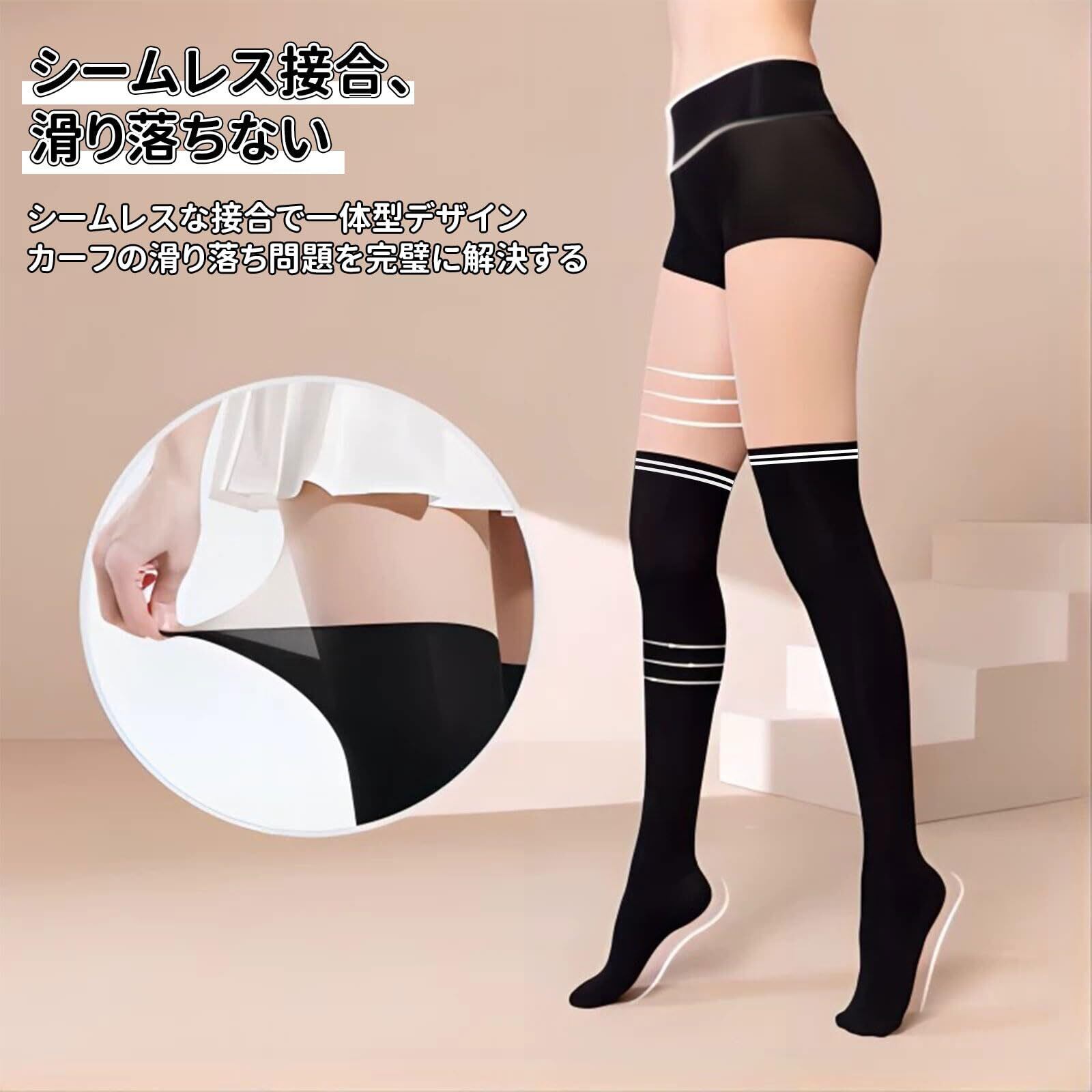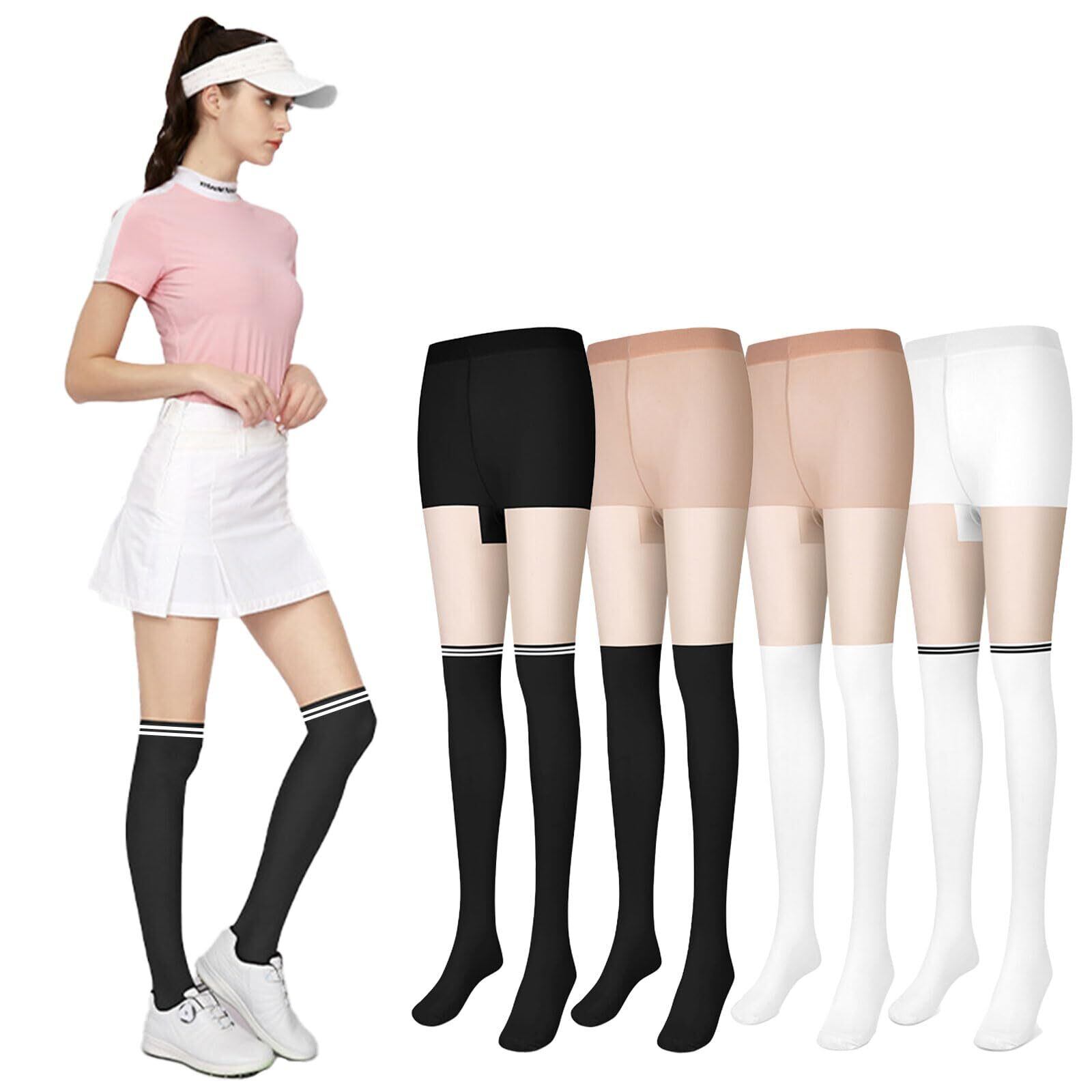 【ソックス一体型革新デザイン】1枚で「ぺチパンツ、ストッキング、ニーソックス」の3役を担うオールインワンゴルフストッキングです。太ももの食い込みや膝上の肉乗りが気になる方にもおすすめのフェイクニーハイデザインです。