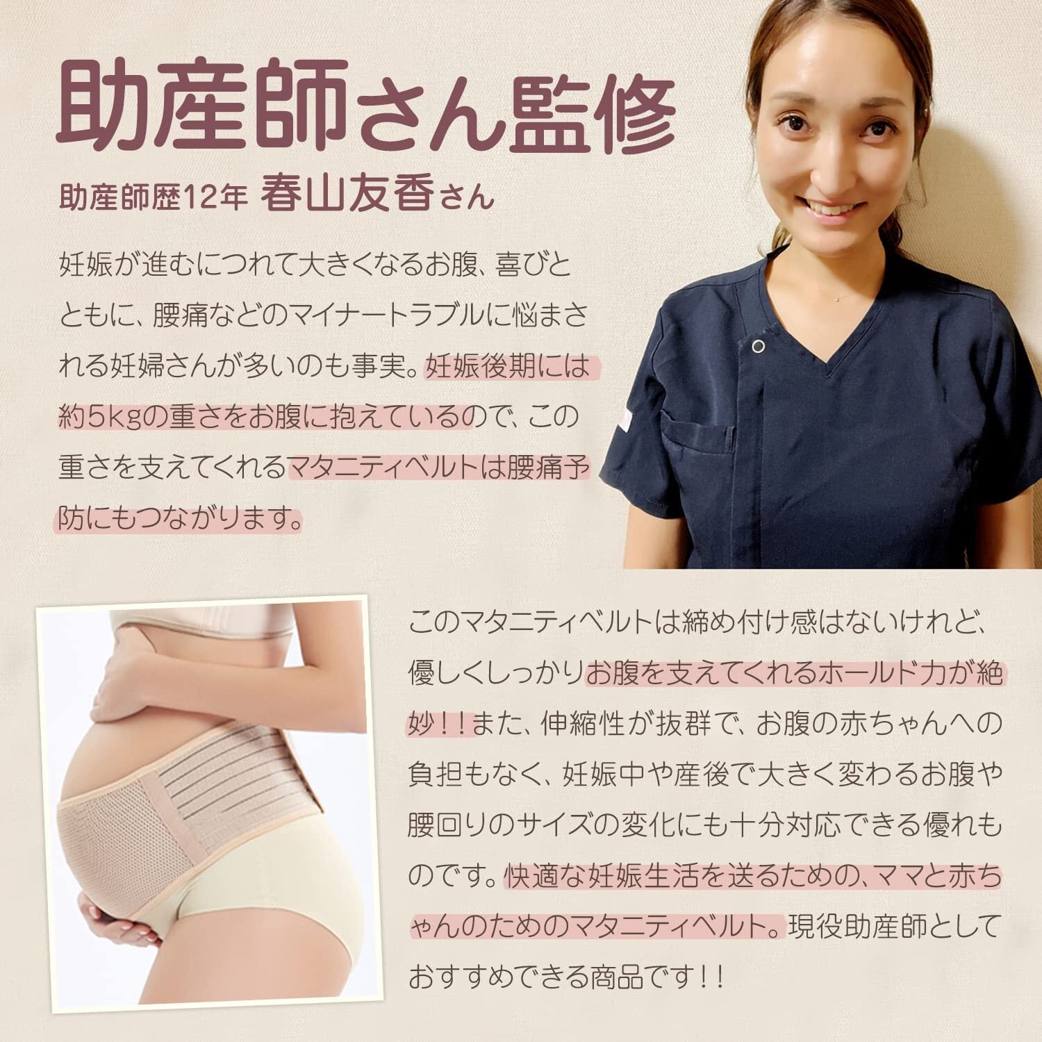 【お腹をしっかりサポート】妊婦さんのお腹を支えるために昔から使われている腹帯。それを脱着しやすく改良したのがマタニティベルトです。ベルトでお腹のふくらみをしっかりと支えます。腰に負担がかかる、歩きにくくなるなどでお悩みの方は、ぜひ一度お試しください。