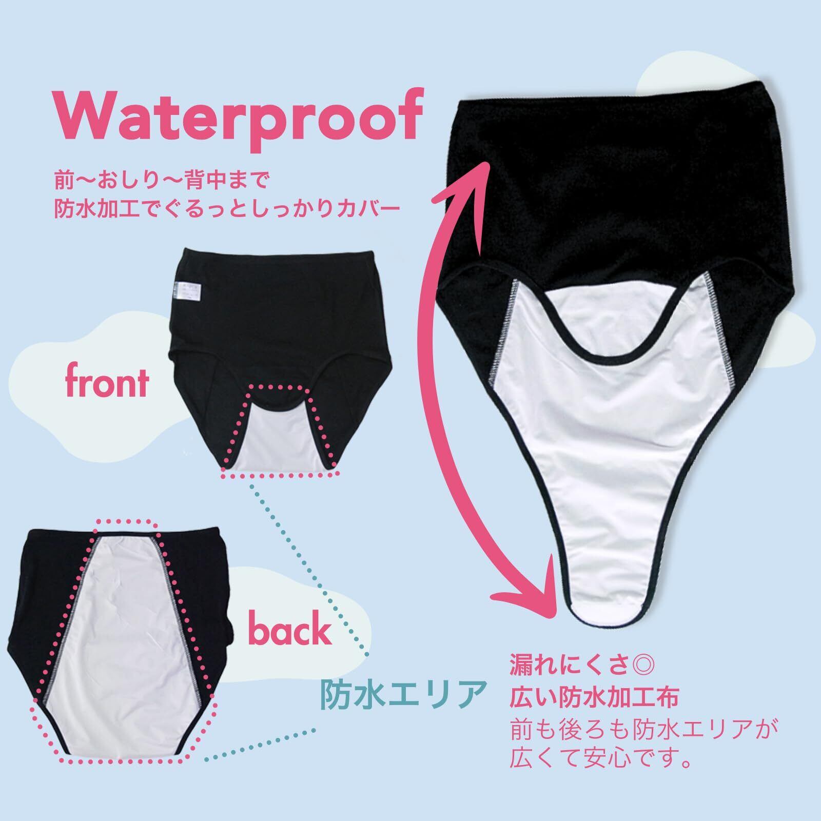 【漏れをしっかりガード】クロッチ部分から腰の後ろまで広範囲にわたりすっぽりと防水布でカバー。蒸れにくい素材で、産後の悪露なども漏れずにしっかりガードします。入院中も安心してお休みいただけます。