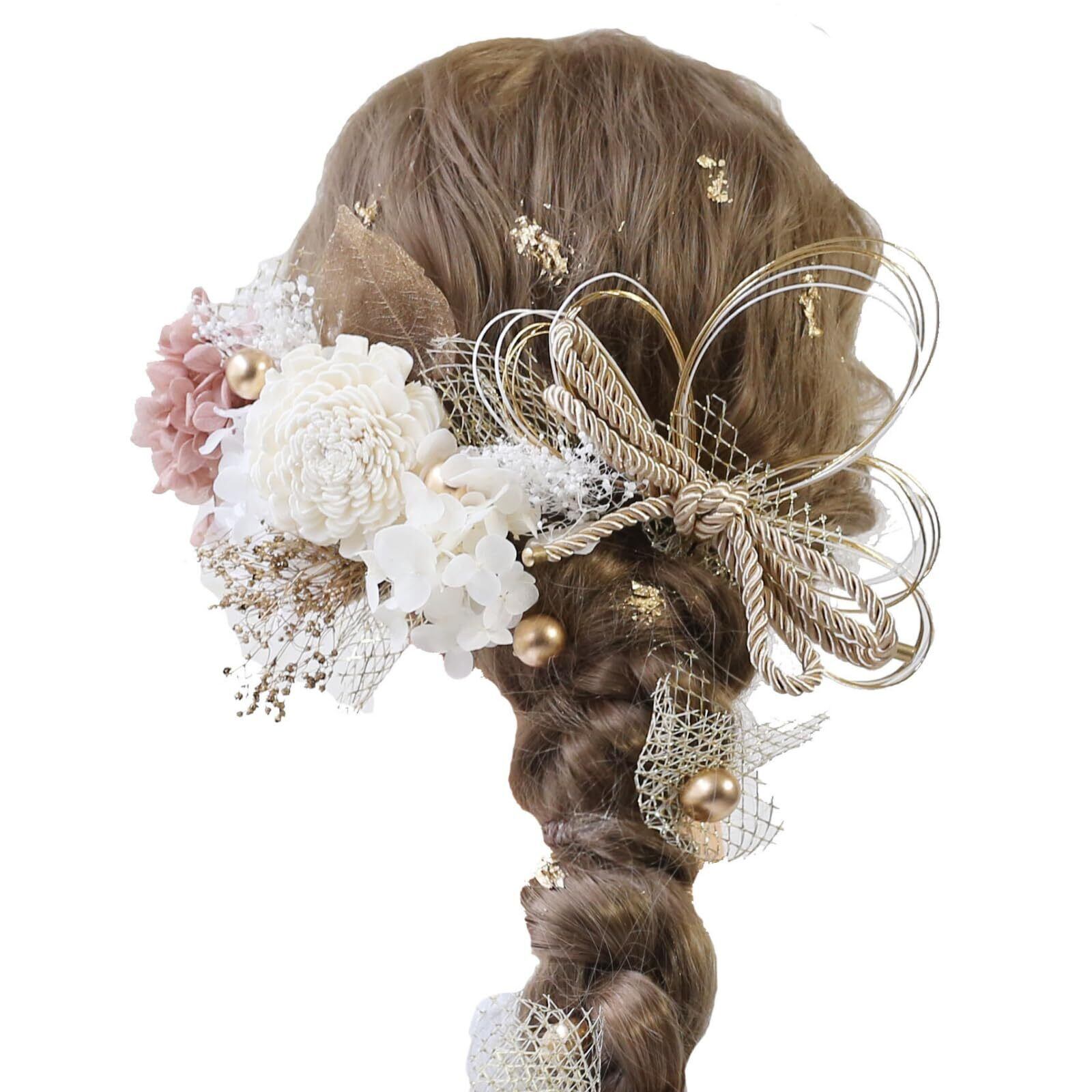 【2022最新】Bud Flower バドフラワー 髪飾り 成人式 卒業式 ドライフラワー 水引 金箔 和装 振袖 袴 ヘッドドレス 結婚式 七五三 アクセサリー hair-180 (ピンクベージュ) | 無意味ステッカー