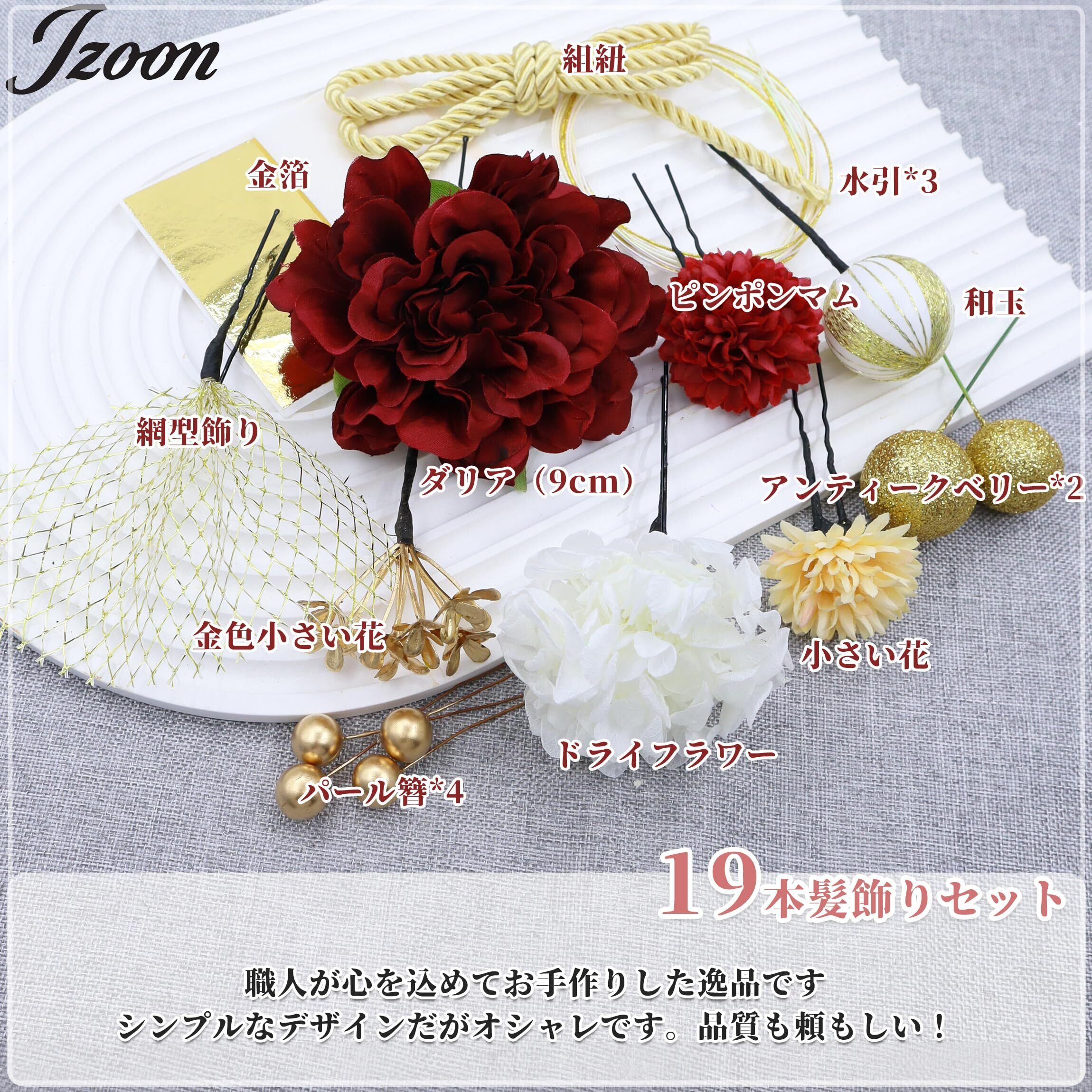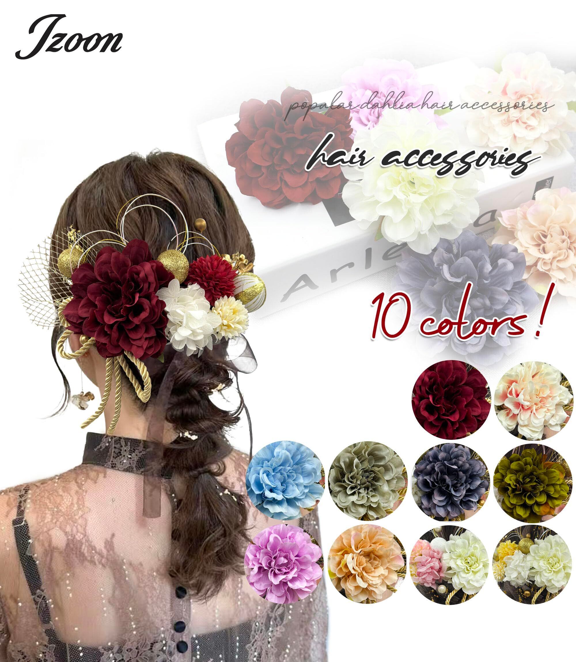 [JZOON] 成人式 髪飾り【10色展開】 ドライフラワー ダリア あじさい かすみ草 造花飾り ヘアアクセサリー 和玉 赤 ゴールド 水引 ヘッドパーツ 振袖 着物 卒業式 七五三 浴衣 袴 結婚式用 手作り 専用ケース付き Y3330