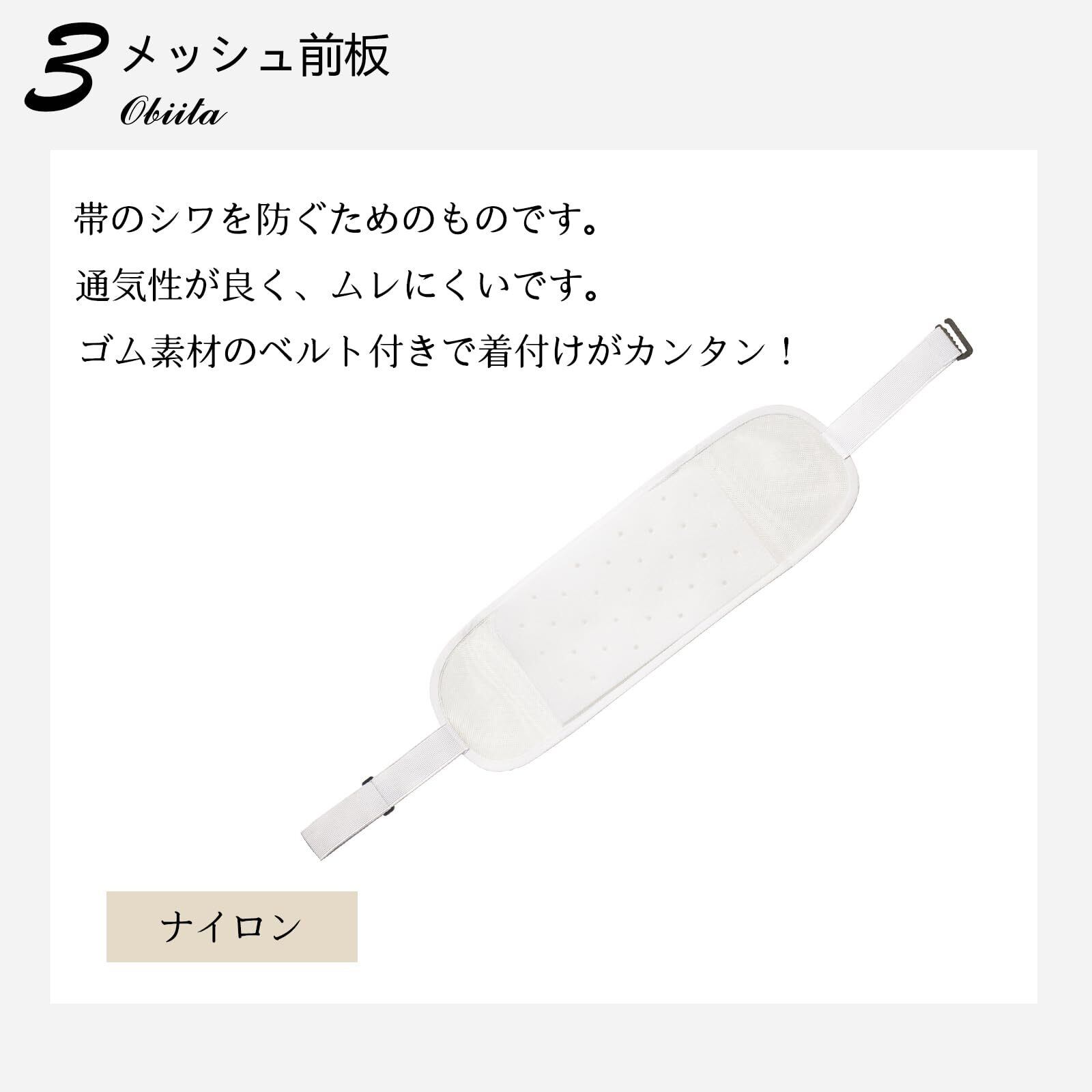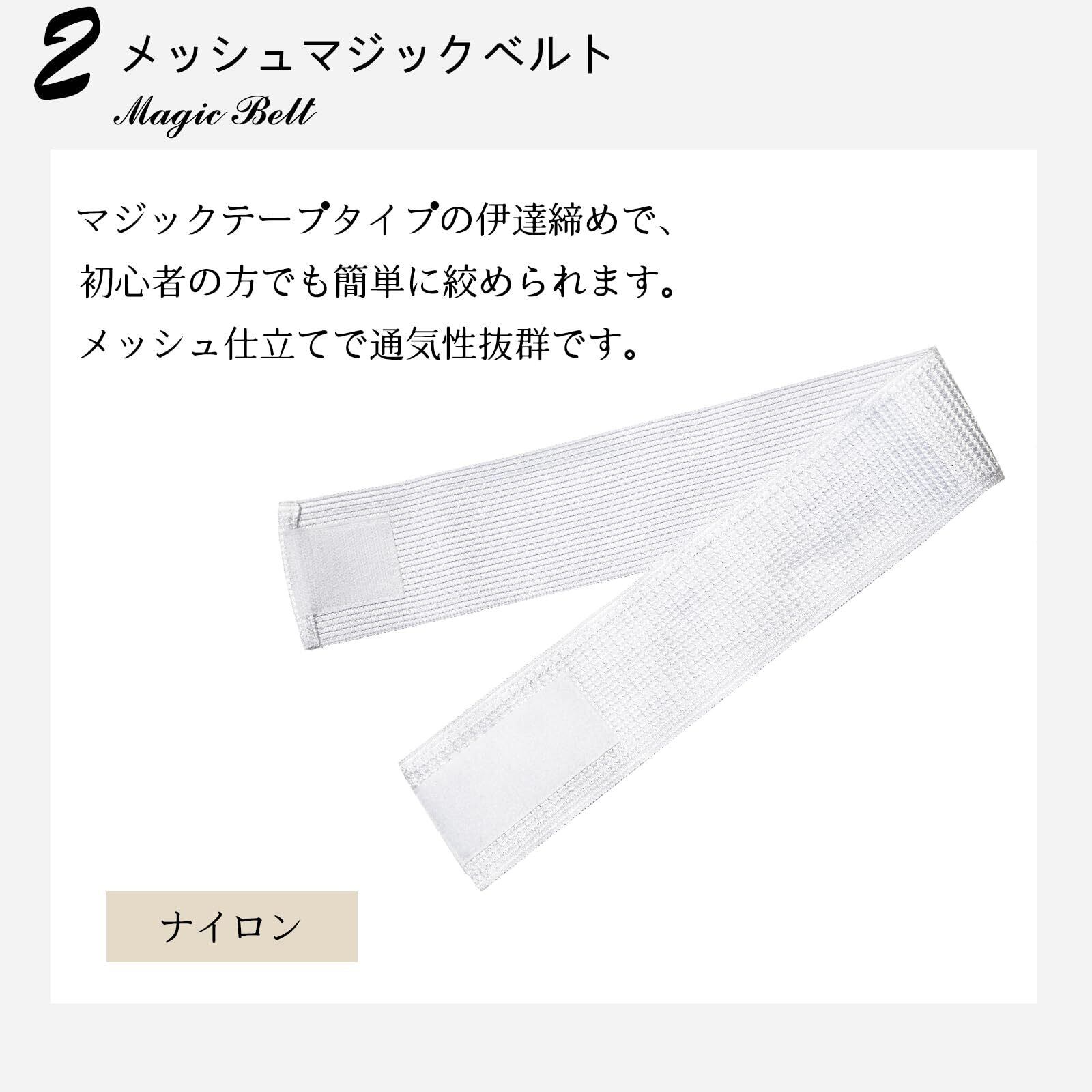 【簡単でシワなし】メッシュマジックベルトはマジック付きで初心者でも簡単にきれいに着物を整えます。前板は帯にはりを持たせます。衿も前身頃も着崩れなしで、花火大会から、パーティー、お祭りなどまでご安心で着物を楽めていただけます。