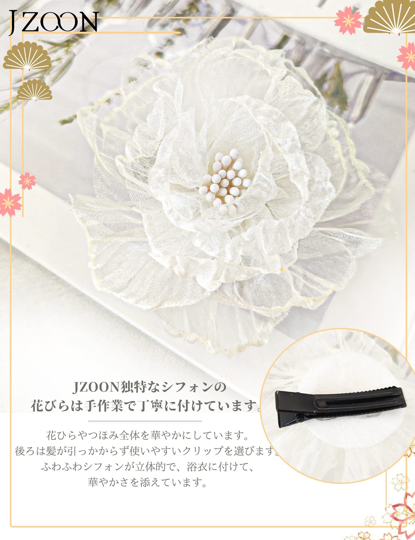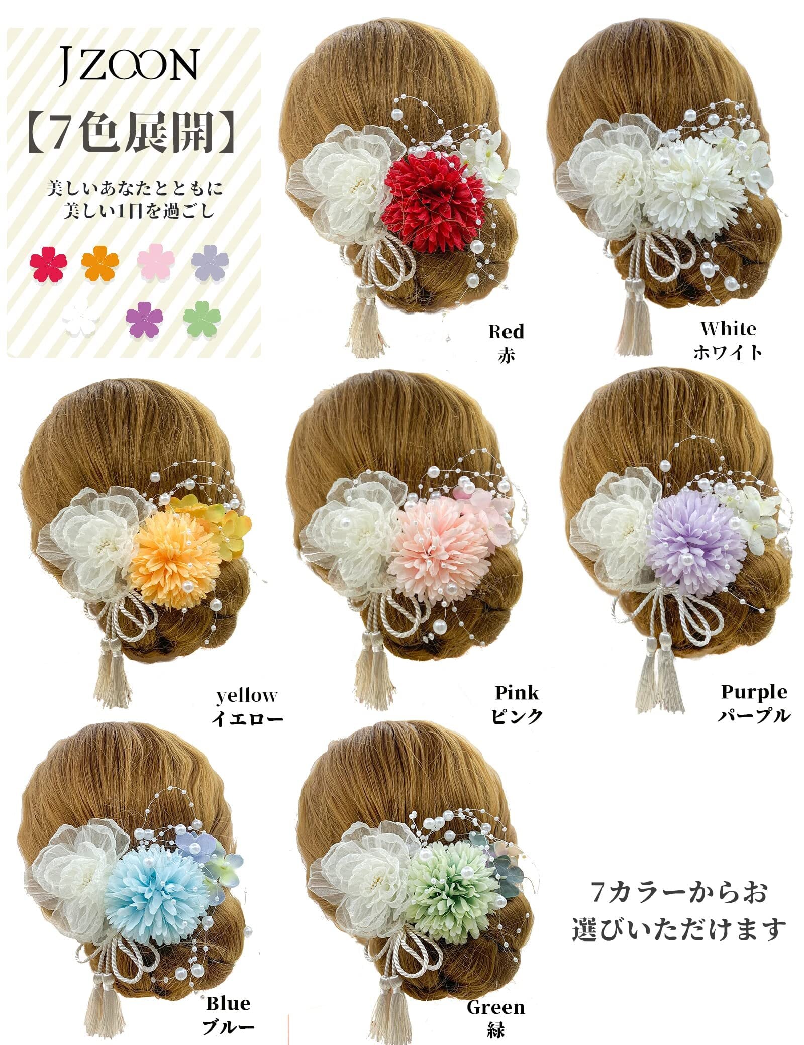 【七色展開】お手作りした髪飾りは7色からお選びいただけます。お花はUピンで、髪に優しく、脱着簡単!髪型に合わせて、お花の角度を調整することができ、アレンジも自由です。