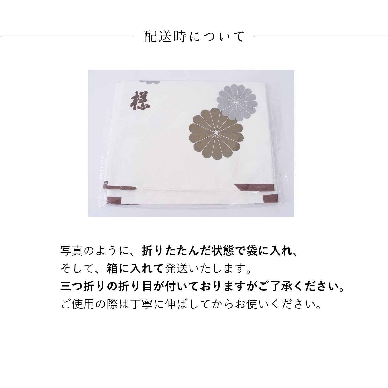 ・輸送コスト削減のためコンパクトに三つ折りにしてお届けとなります。・三つ折りの折り目が付いておりますがご使用には問題ございません。予めご了承ください。なお、ご使用の際は丁寧に伸ばしてからお使いください。