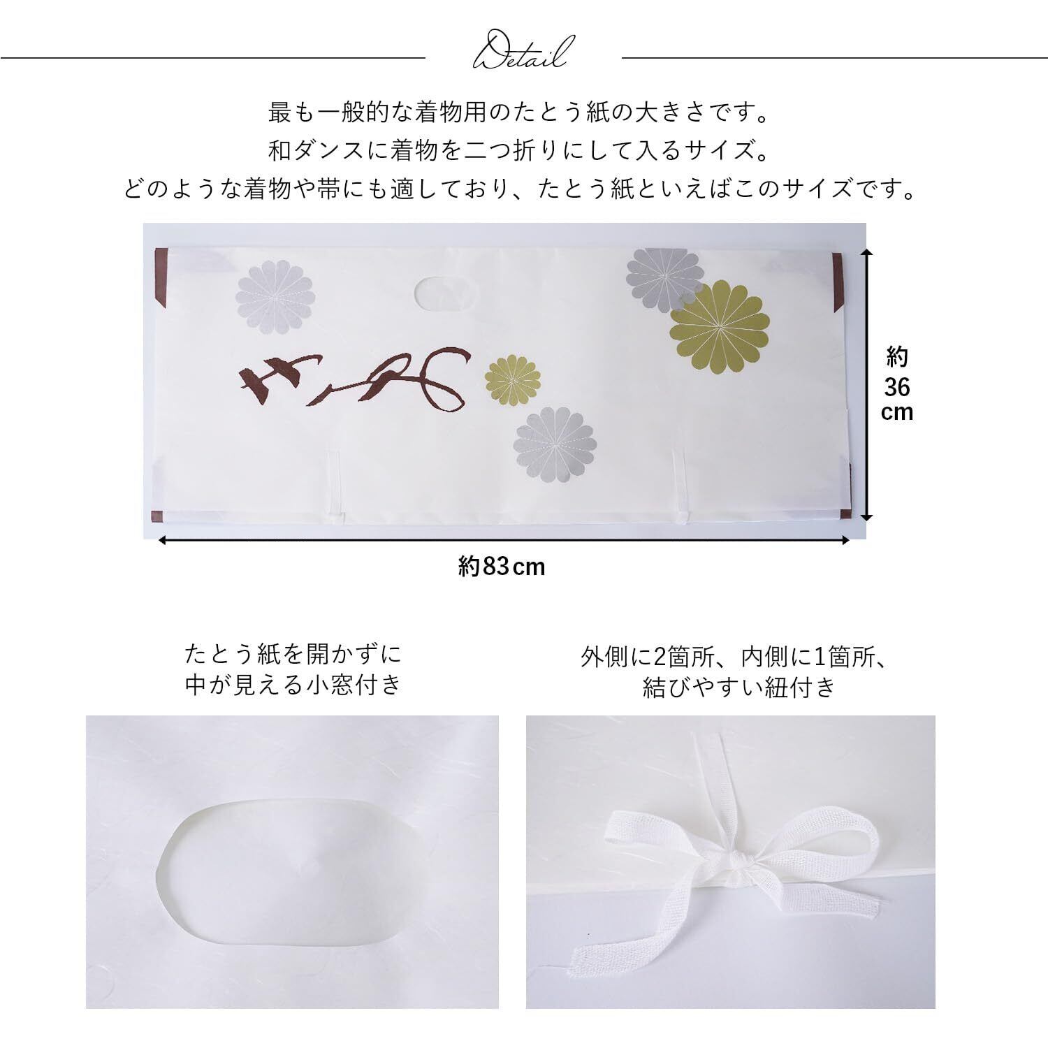 【便利な小窓付き】たとう紙を開かずに中身が見える「小窓」は毎回確認のためにたとう紙を開封しなくても簡単に中に何が入っているかわかります。こちらの商品の紐は綿の紐になっているので結びやすく耐久性も優れています。