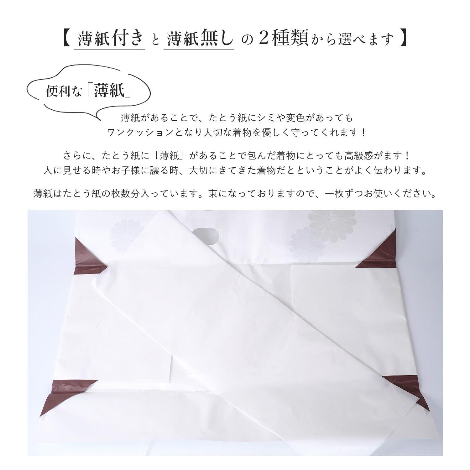 【薄紙ありと薄紙無しの2種類】薄紙があることで、たとう紙にシミや変色があってもワンクッションとなり大切な着物を優しく守ってくれます!さらに、たとう紙に「薄紙」があることで包んだ着物にとっても高級感がます!人に見せる時やお子様に譲る時、大切にきてきた着物だとということがよく伝わります。薄紙はたとう紙の枚数分入っています。束になっておりますので、一枚ずつお使いください。