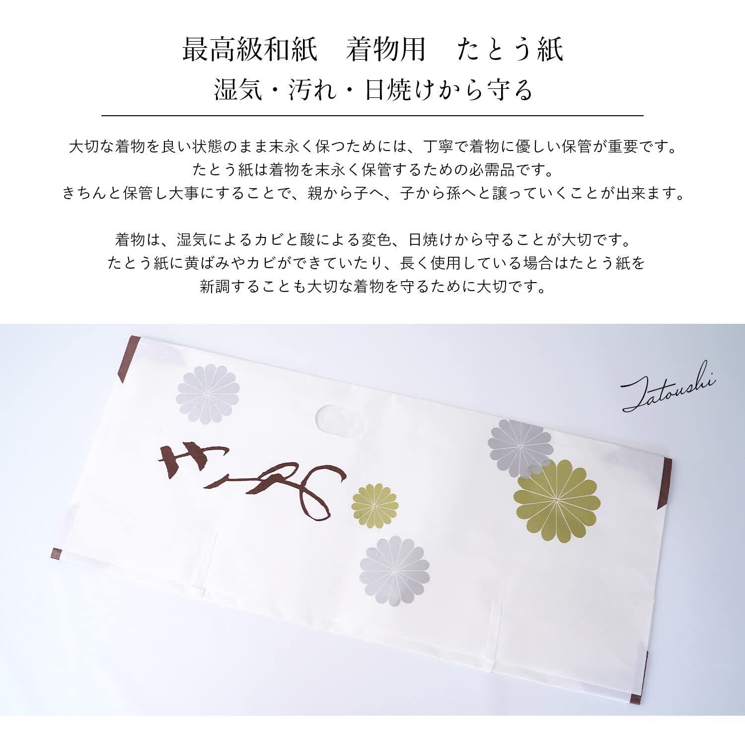きちんと保管し大事にすることで、親から子へ、子から孫へと譲っていくことが出来ます。大切な着物を良い状態のまま末永く保つためには、丁寧で着物に優しい保管が重要です。たとう紙は着物を末永く保管するための必需品です。