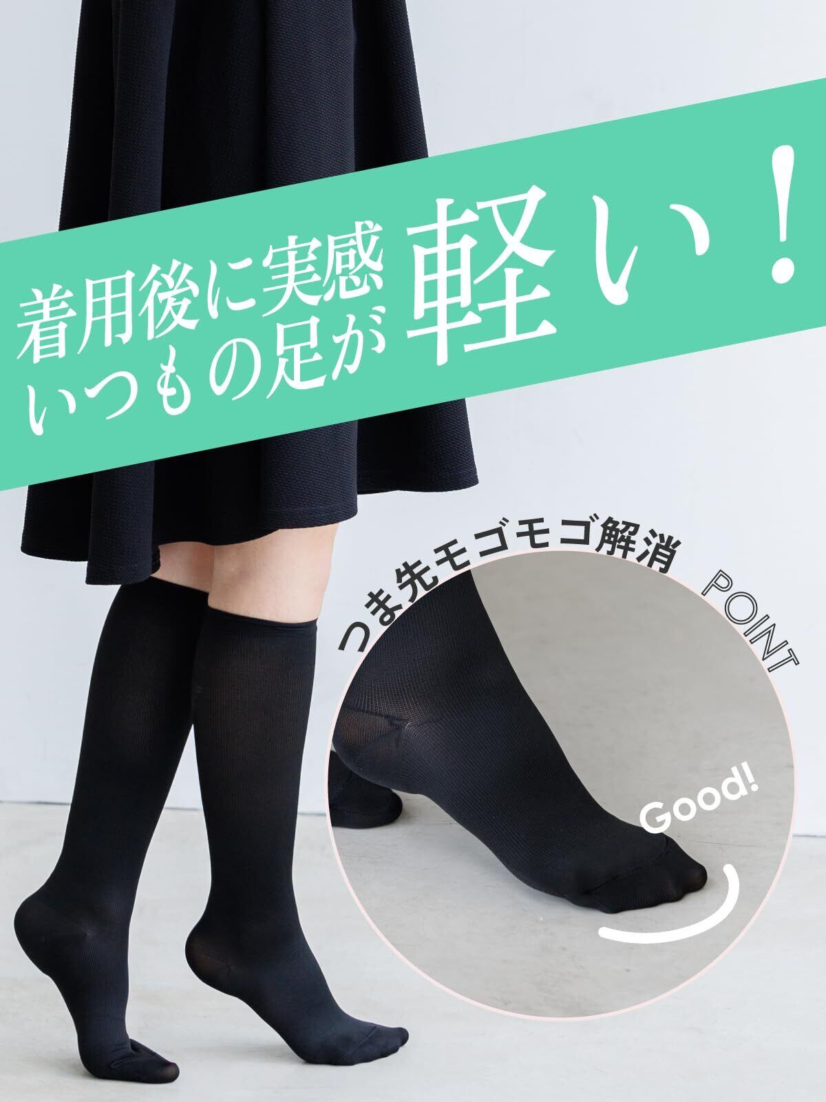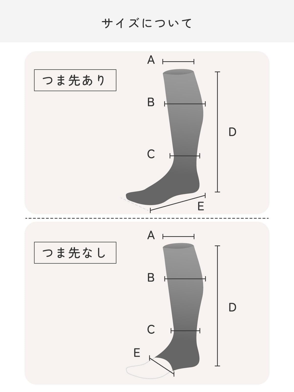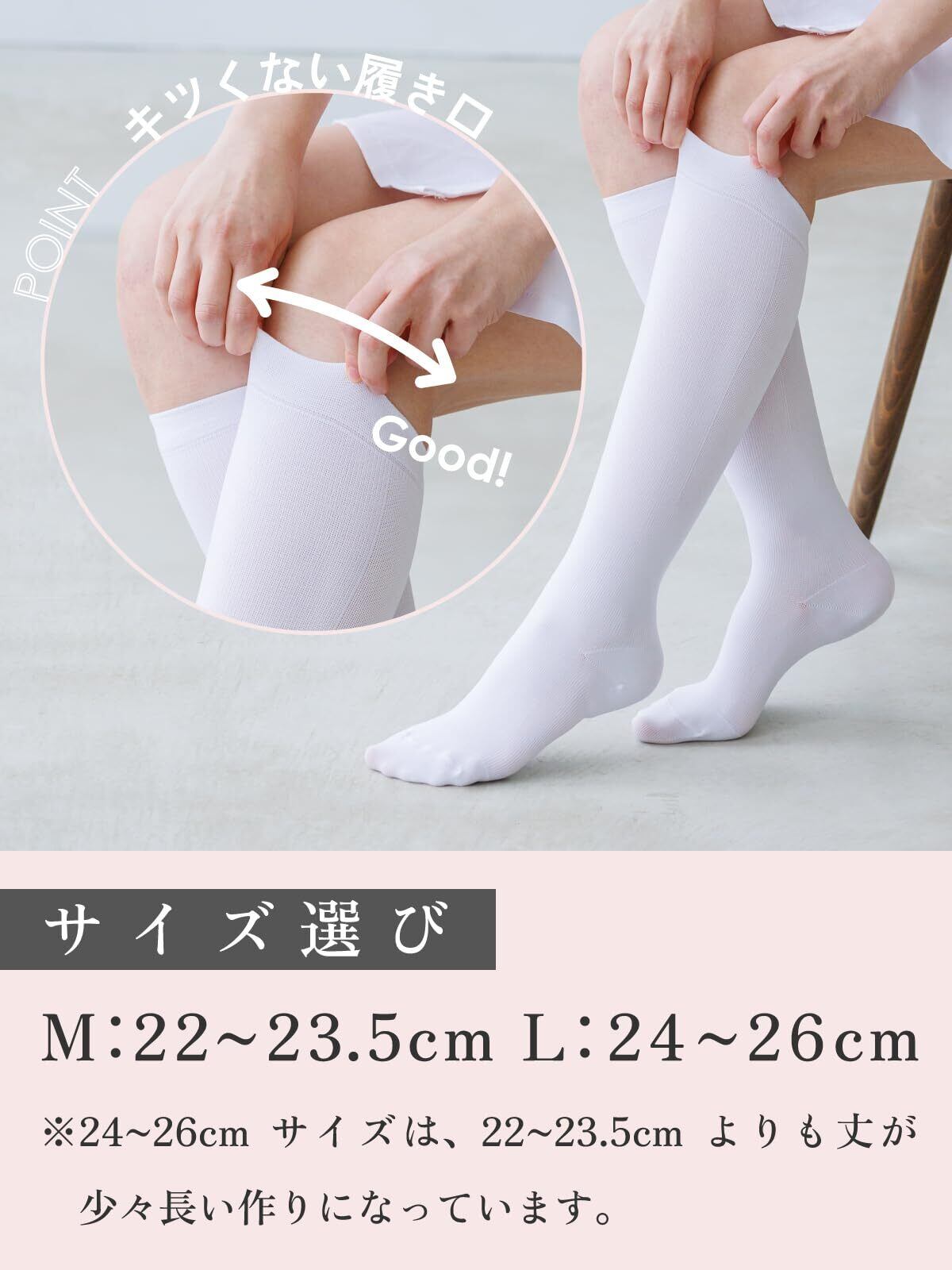 【高い伸縮性だからサイズ選びに悩まない】ひざ下、ひざ丈どちらでも対応いただけるような伸縮性を実現しました。つま先部分は、長時間の着用でキツく感じるの防ぐためにあえてゆったりと空間を持たせて作っております。