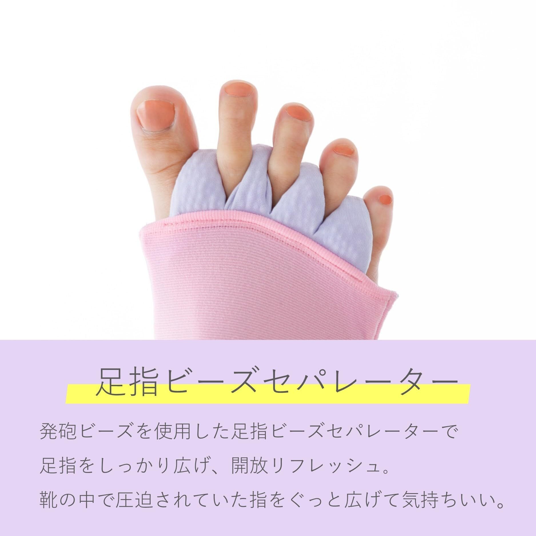 【】 ●頑張った脚に、帰宅後すぐに集中ケア。 ●ふくらはぎ、足指、足裏を究極3点ケア。 ・ふくらはぎ:段階圧力設計(足首25hPa、ふくらはぎ17hPa)。 ・足指:セパレーターで縮こまった足指を広げる。足指の付け根までしっかり解放リフレッシュ。 ・足裏:ビーズクッションで歩くたび足裏を刺激。 ●ふんわりパイル編みでやわらかなはきごこち。やわらか発砲ビーズでつぶれにくい。 ●こんな時に 夕方の脚がパンパン… パンプスの中で足がぎゅうぎゅう… 歩きつかれて足裏がじんじん… ●サイズ:MLサイズ(ふくらはぎ36~42cm、足首21~25cm、足サイズ23~25cm) ●カラー:ピンク&パープル ●タイプ:ソックスタイプ、おうち用 [やぶれ、伝線を防ぐために] (1)ご使用前に、手足のつめやかかとをなめらかにし、指輪などをはずす。(2)つめを立てたり、一気に引き上げたりしない。