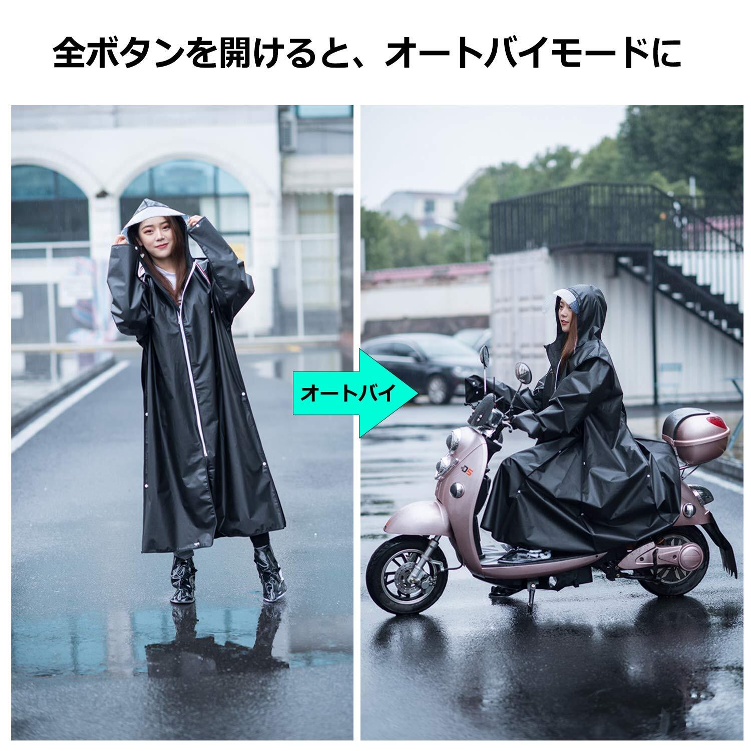 【変形案内説明&各シーンで活躍】まず、①レインコートの全ボダンを閉じていただければ、普通の歩行モードとなれます。②レインコートの背中にある2つのボダンだけを開けると、通勤&通学&登山用モードモードとなります。③レインコートの両側にある計4つのボダンだけを開けると、自転車用モードとなります。④レインコートの全ボダンを開けると、オートバイ用モードとなります。⑤襟とフードはドローストリングで留めることができ、サイクリング中や風の強い時に吹き飛ばされるのを防ぐことができます