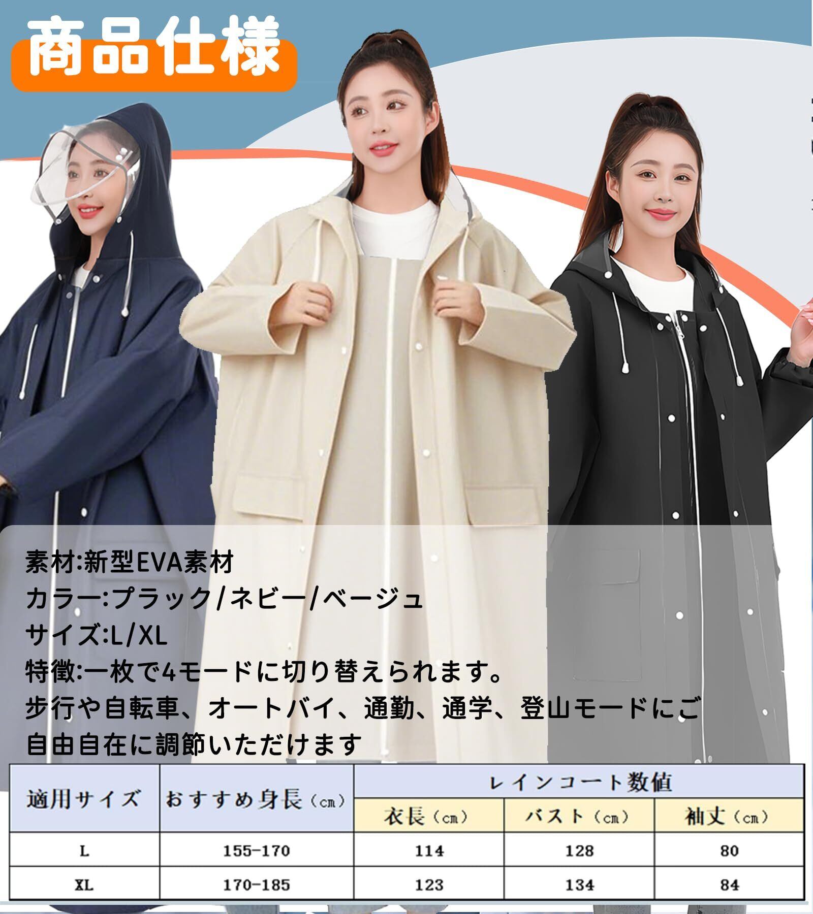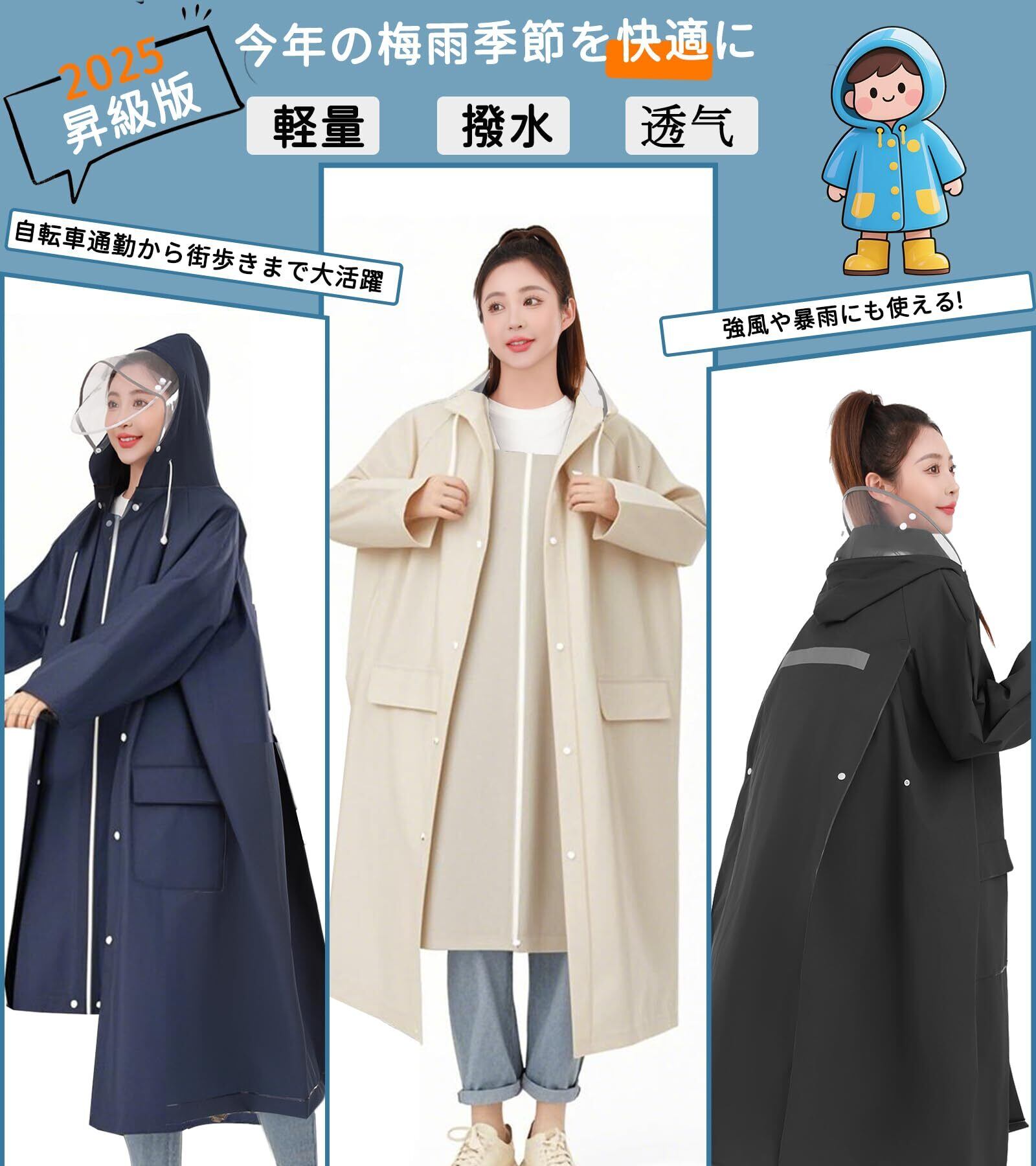 【多層防水・超撥水加工デザイン】エコなEVA素材を採用し、防水力が高く、丈夫で耐久性にも優れたレインウェアです。耐水圧2500mm、防水力が高く丈夫なレインコートです。3重撥水加工を施され、雨水が染み込まずしっかり弾けます。さらに、ファスナー&ボタンの二重設計で、ファスナーを閉じてボタンを留めることで雨水や風の侵入を防ぎ、雨水が染み込まずしっかり弾けます。