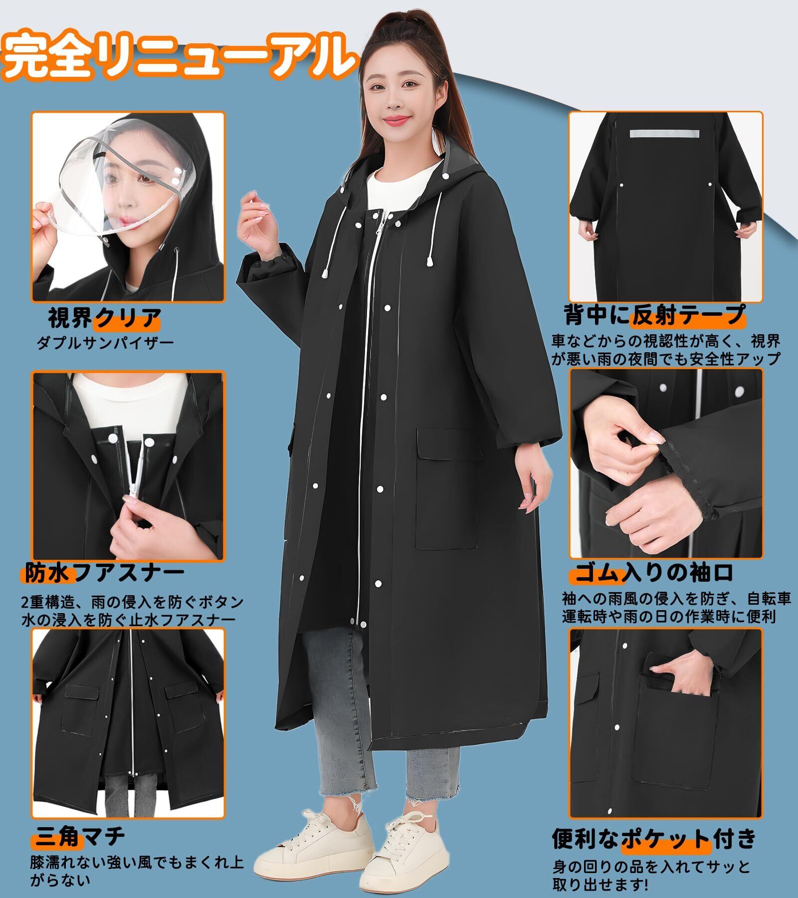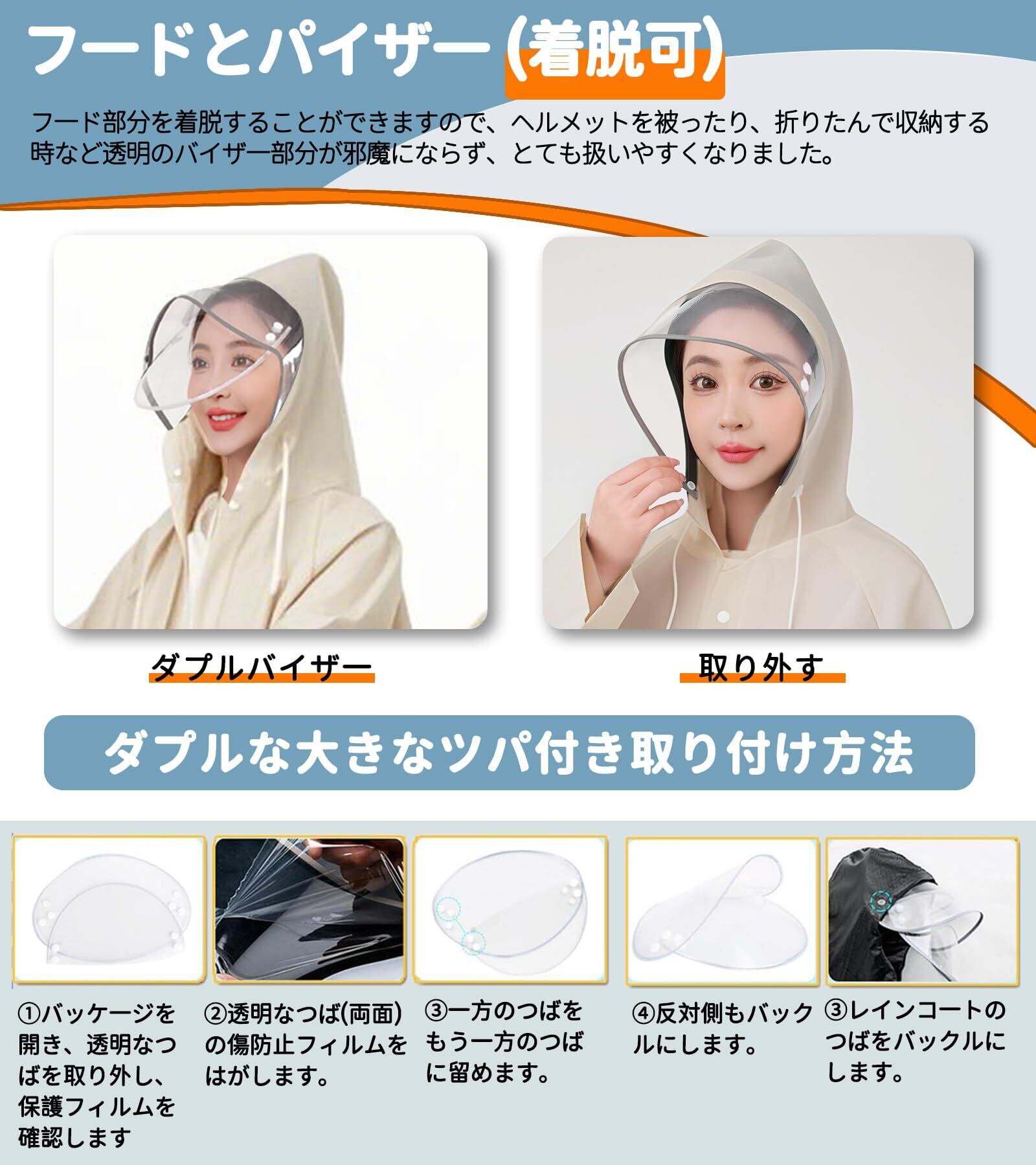 ️【二重レインバイザー付き】取り外し可能な透明バイザー付属、フードにつければ、飛沫防止、風・雨・雪よけしながら、クリアな視界を確保可能。斜めから雨が来ても顔が濡れにくいし、風が強い日でもフードが吹き飛ばされません。フードはロープ付き、サイズを調節して雨水の浸入を防ぐことができます。これさえあれば傘をささなくても、自転車やバイク運転の時も、視界をこもらずに安全運転ができて大変便利です。