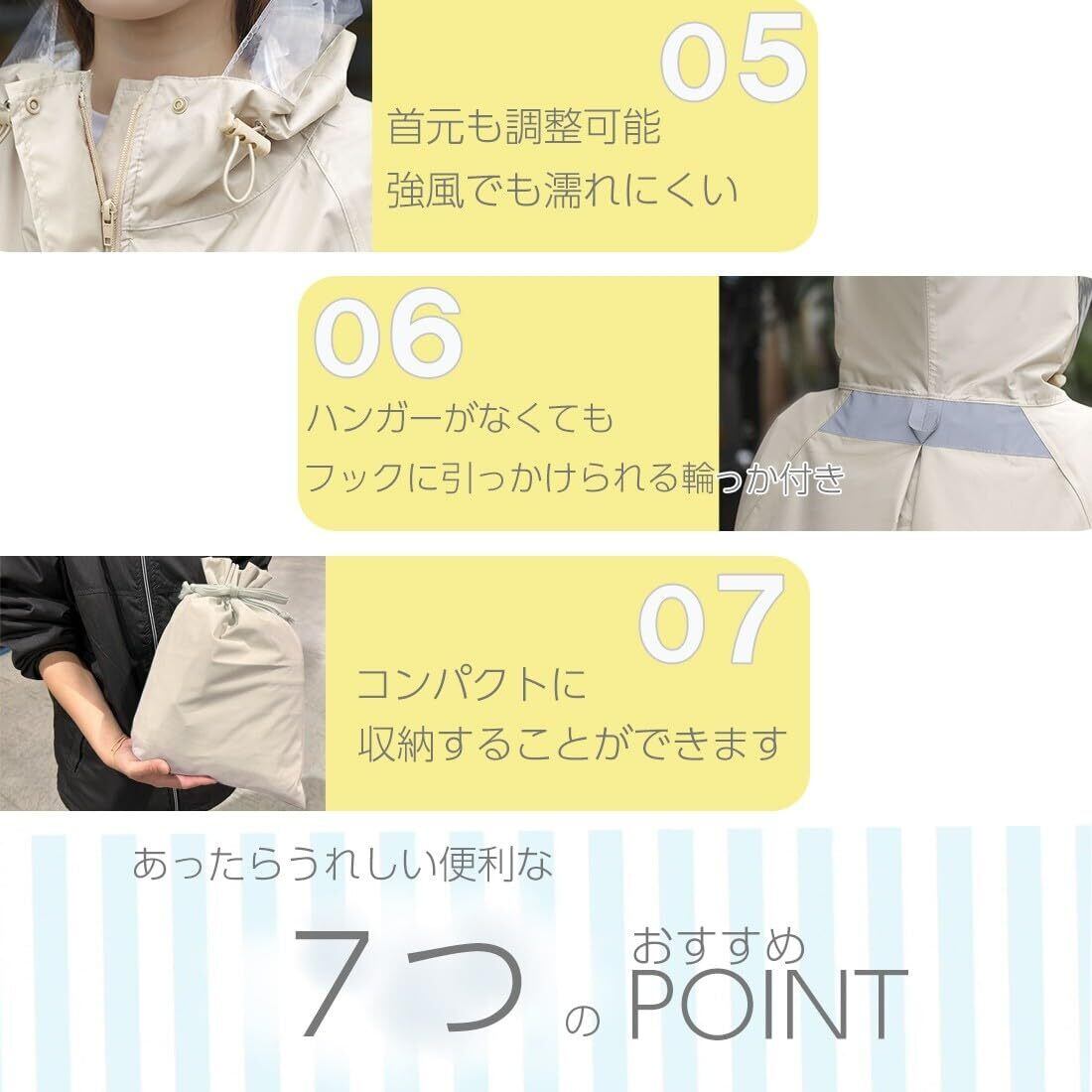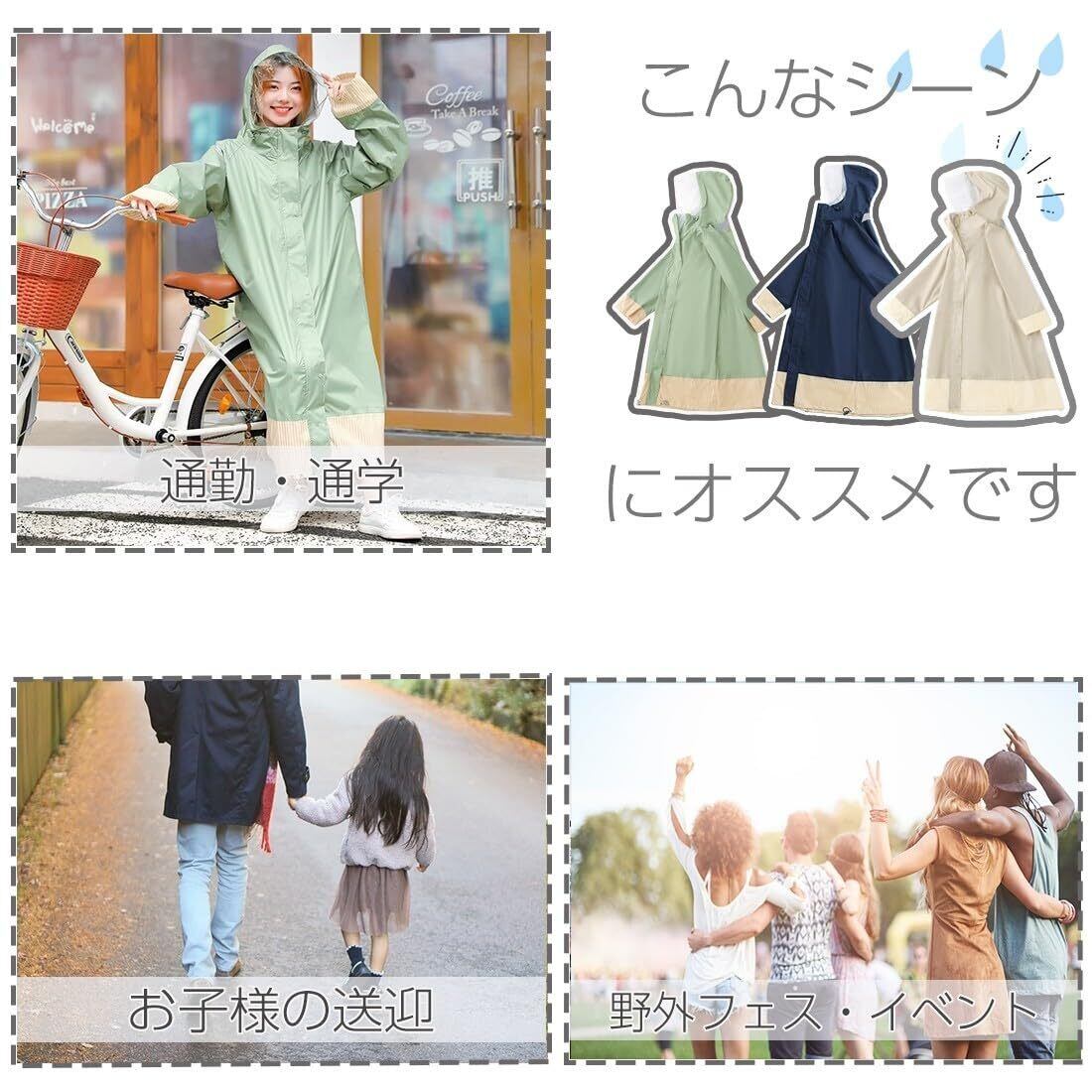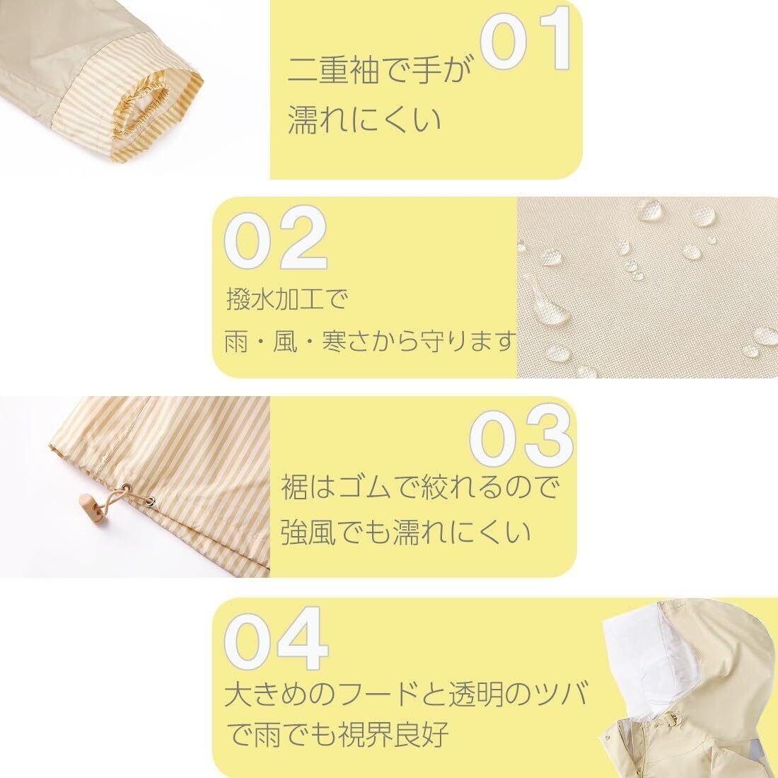 裾はゴム紐で絞れるので、強風のときでも捲れ上がりにくい仕様です。袖は自転車のハンドルごとカバーできるよう大きめ、さらに雨風の入りにくいよう二重袖を採用しています。前方はファスナー開閉でしっかりガード。衣服や身体が雨に濡れるストレスを回避します。