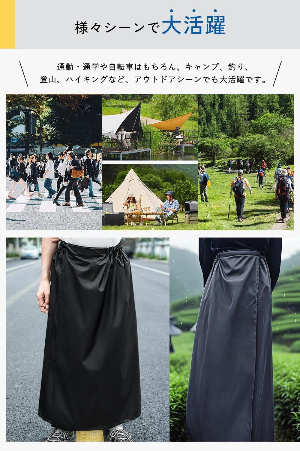 【簡単着脱でしっかり防護】レッグカバーは伸縮バンドとストラップでサッと装着できるから、雨や泥も簡単ブロック。レインスカートはマジックテープ式で、スカートやパンツの上から簡単に着脱可能。ウエスト幅の微調節もできます。撥水透湿素材で蒸れにくく、すねまで快適にキープ。軽量で携帯しやすく、アウトドア作業や雨の日の通勤にもストレスフリー。