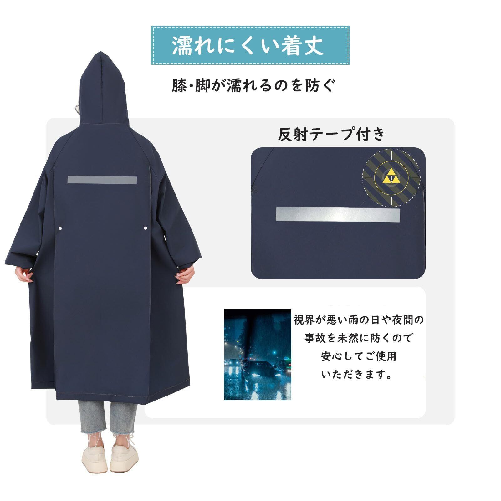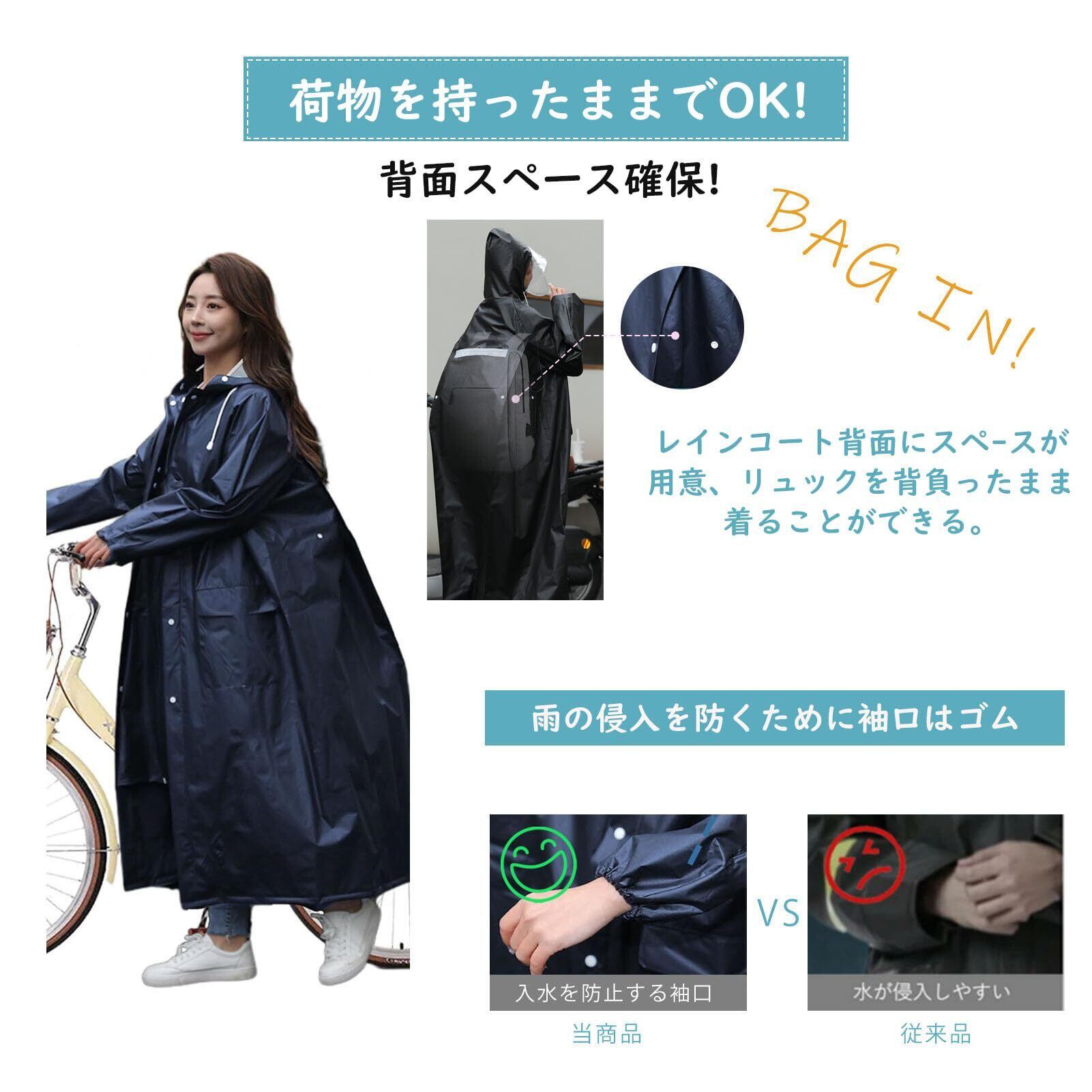 【袖口調節可能 &反射帯付きリュック着用可能】ロング丈で、足元までしっかり覆えて雨を防ぎます。 レインコートの袖口に付けられたゴムギャザーで、 高い防水透湿の生地を使っていても、縫い目からは浸水してしまう、 そのためシームテープ加工を施し、水が入ってくるのを防ぐ、夜間の安全を考慮し、反射帯を背面にかけて体を覆うように採用することで、車などからの視認性も高まり、夜間の自転車でも安全アップです。