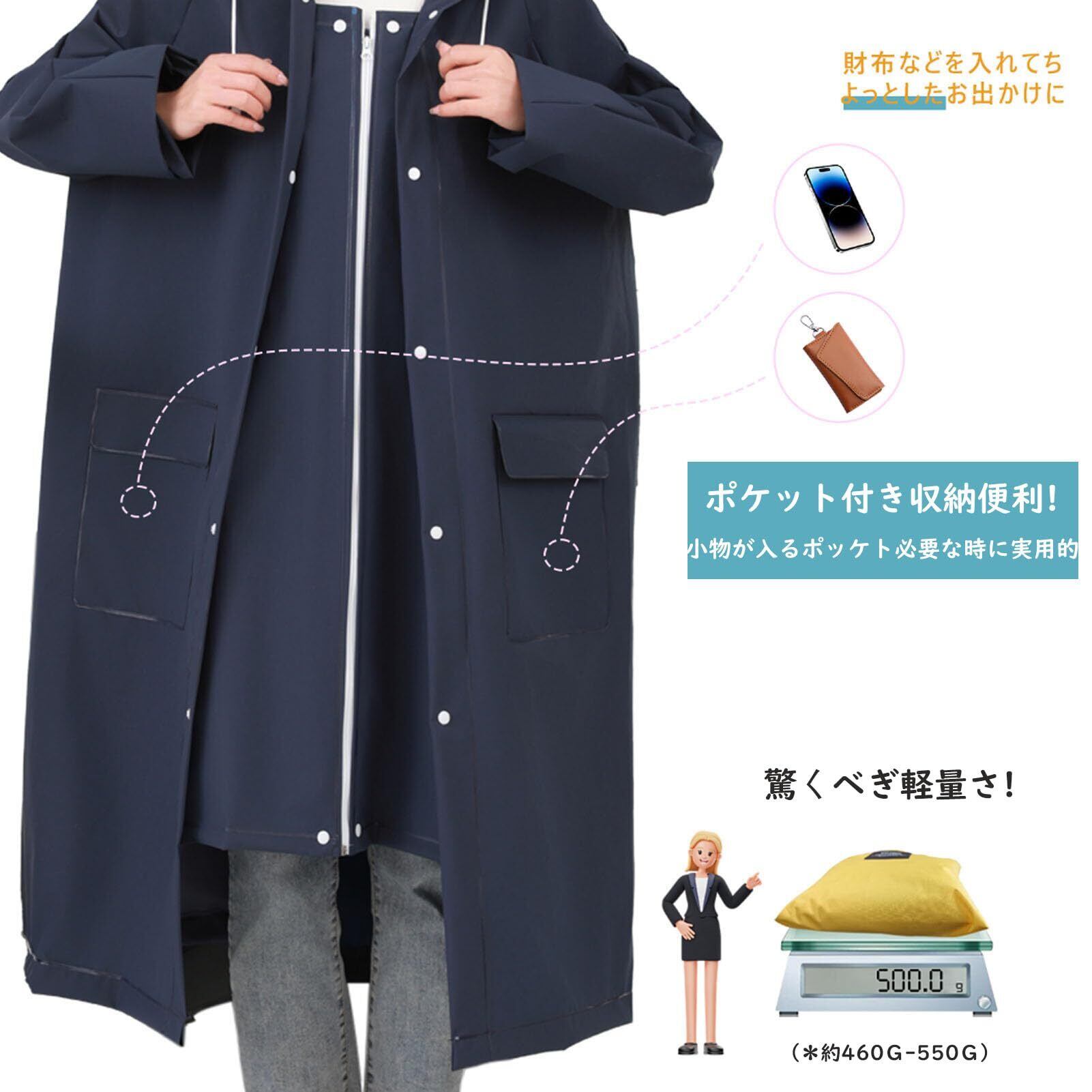 【全身をすっぽり覆うゆったりサイズ】全身をすっぽり覆って雨から守ってくれる安心のロング丈が嬉しいポイント!バックやリュックを背負ったままでも着用できます。 フード(着脱可)にはサイズを調節可能なマジックタイプ仕様:頭のサイズに合わせて調整可能。また雨水の侵入も防止します。 お顔周りをしぼれるフードキュッと閉めれば髪も濡れずにしっかりカバーできます、 おしゃれなだけでなく機能性も高い大人のロングレインコートは、 全身をすっぽり覆い雨風を防ぐロング丈が嬉しいポイント! それに高抗汚れなので、大雨でも心配もいらではありません。