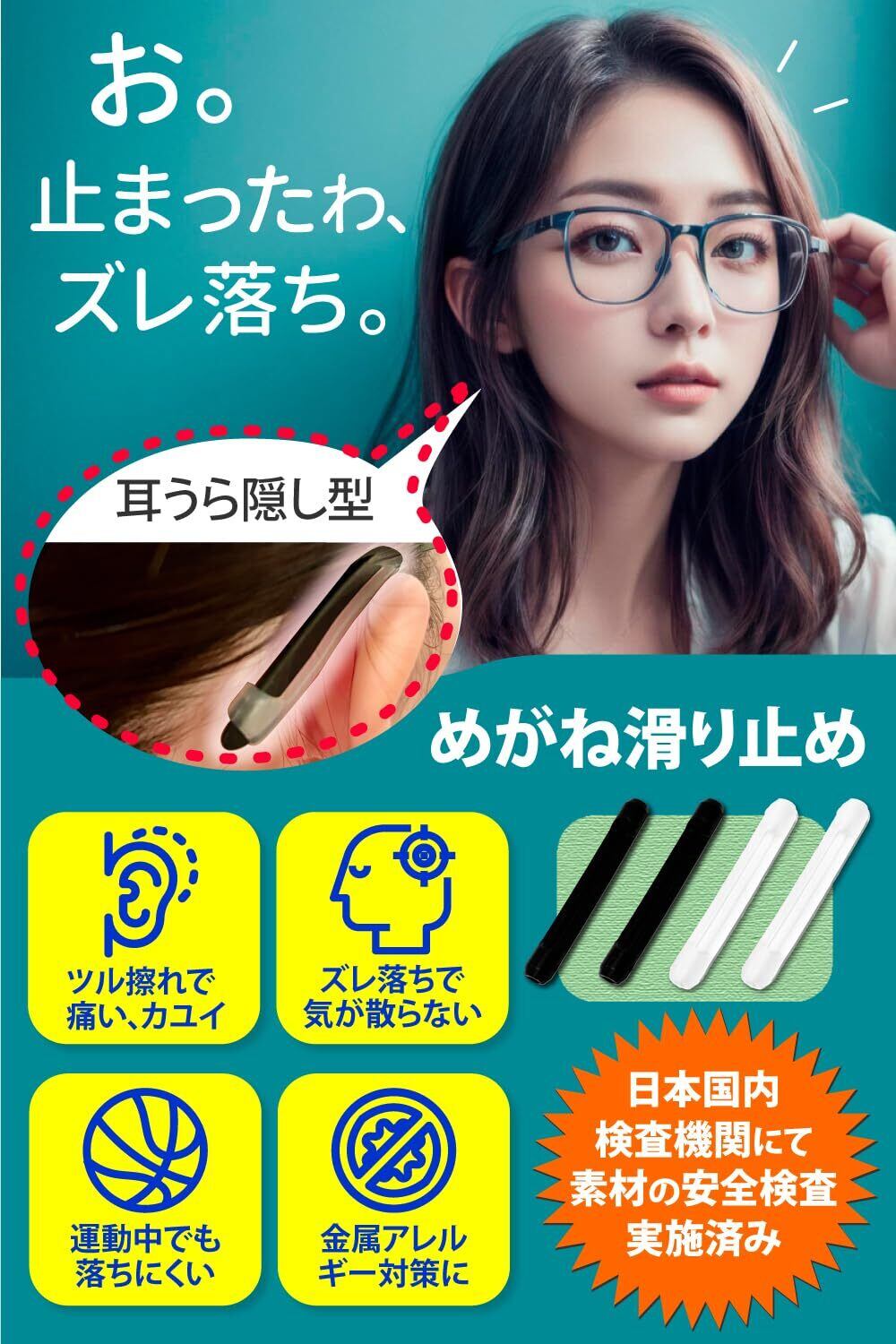 眼鏡をかけている時に耳の後ろが痛い。。メガネのズレが気になって集中できない。このメガネストッパーがそんな悩みを解決!柔らかなシリコンが痛みを防止。滑り止め、ズレ防止に効果的なめがねすべり止め