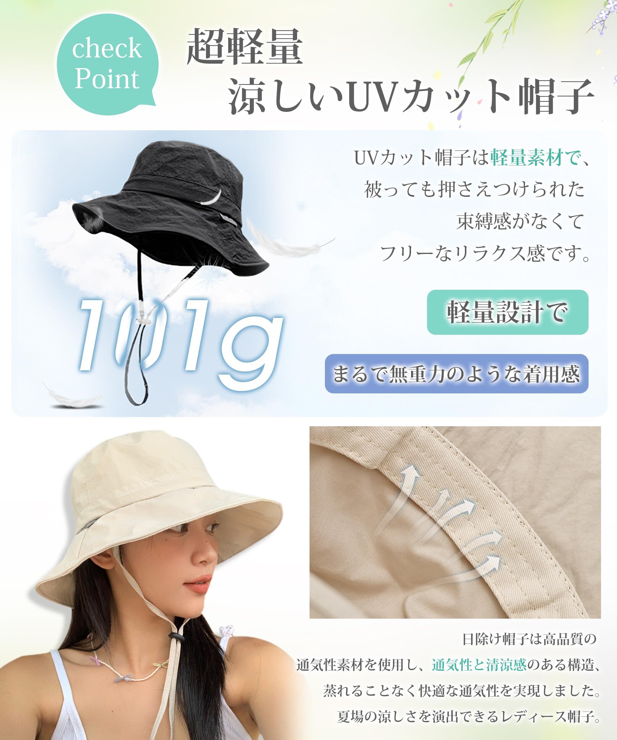 【超軽量・涼しいUVカット帽子】UVカット帽子は軽量素材で、被っても押さえつけられた束縛感がなくてフリーなリラクス感です。涼しいレディース帽子、高品質な防水ナイロンを使用、ウォータープルーフ、風通し良く、で長い間でも快適に使えるようになりました。日除け帽子は高品質の通気性素材を使用し、通気性と清涼感のある構造、蒸れることなく快適な通気性を実現しました。夏場の涼しさを演出できるレディース帽子。
