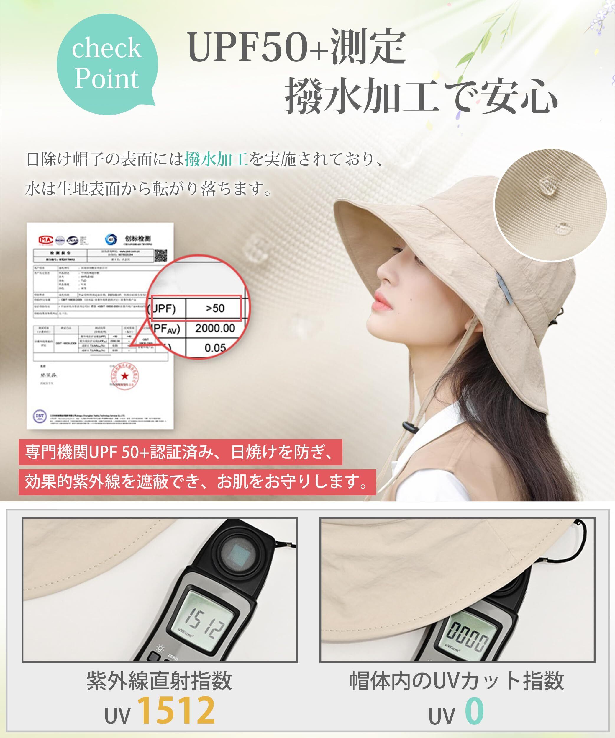【UPF50+測定◎・撥水加工で安心】UVカット帽子は専門機関UPF 50+認証済み、日焼けを防ぎ、効果的紫外線を遮蔽でき、お肌をお守りします。レディース帽子は紫外線を360度に防止して、さらり日差しの照り返しによる眩しさ防止にもなります、UV効果の強い日差し季節には最適です。日除け帽子の表面には撥水加工を実施されており、水は生地表面から転がり落ちます。霧・急な雨を心配することはありません。旅行やちょっとしたお出かけにも大変便利です。