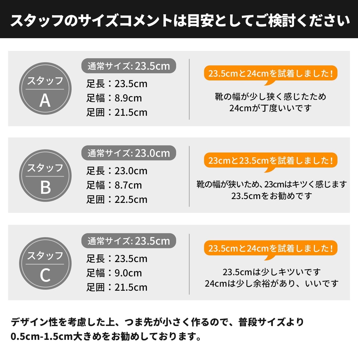 「サイズ推奨」デザイン性を考慮した上、つま先が小さく作っています。着脱便利ですが、履き口が小さい可能性もございます。足の形が幅広.甲高、または外反母趾の方は靴幅の数値に参考しながら、慎重にお選び頂ければ幸いです。