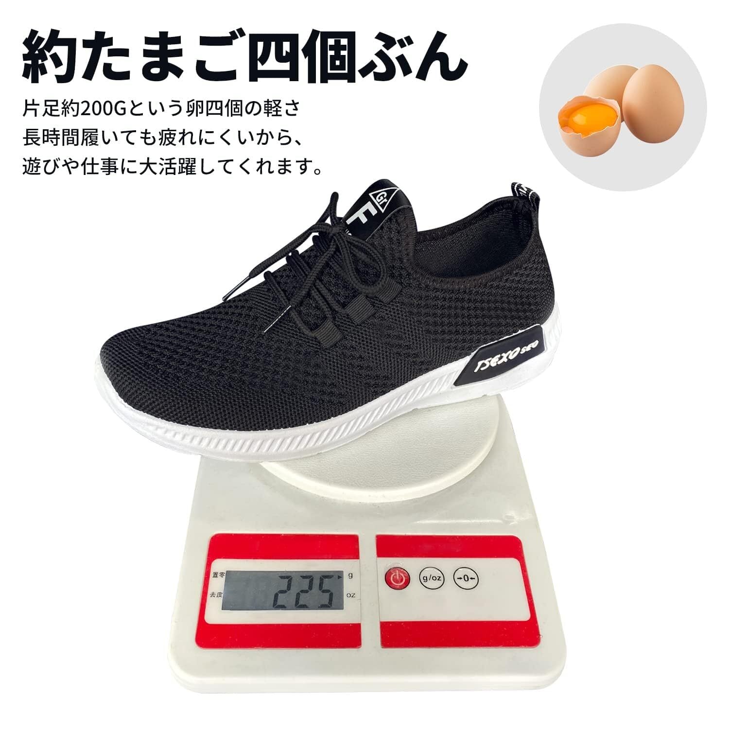 「約たまご四個ぶん」片足約200gという軽さ!長時間履いても疲れにくいから、遊びや仕事に大活躍してくれます。母の日へのプレゼントとしての適性もあります。