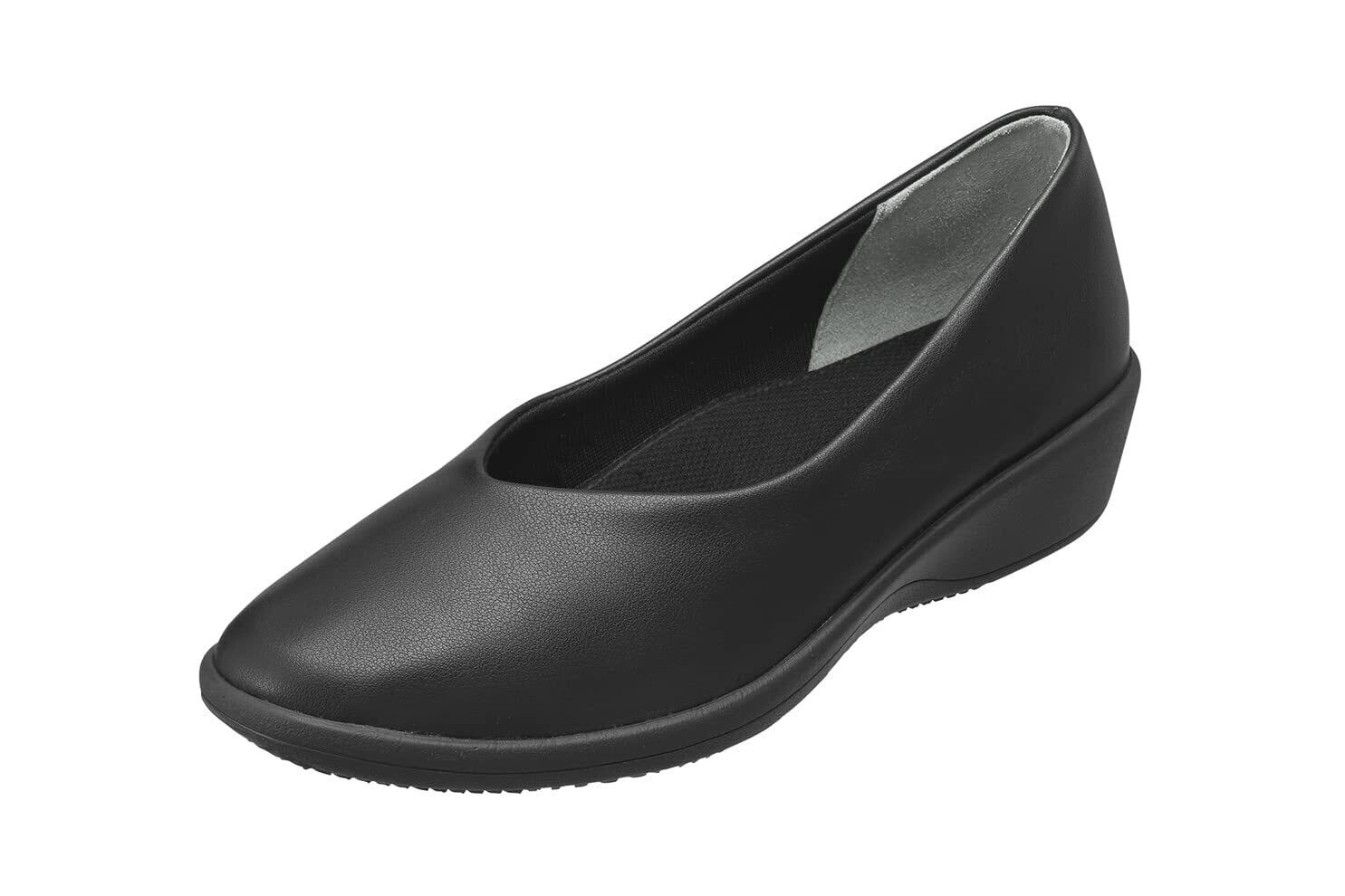 Vカットデザインでスッキリとした足元を演出。伸縮性のあるストレッチ合皮が足に優しくフィットする軽量オフィスパンプス。