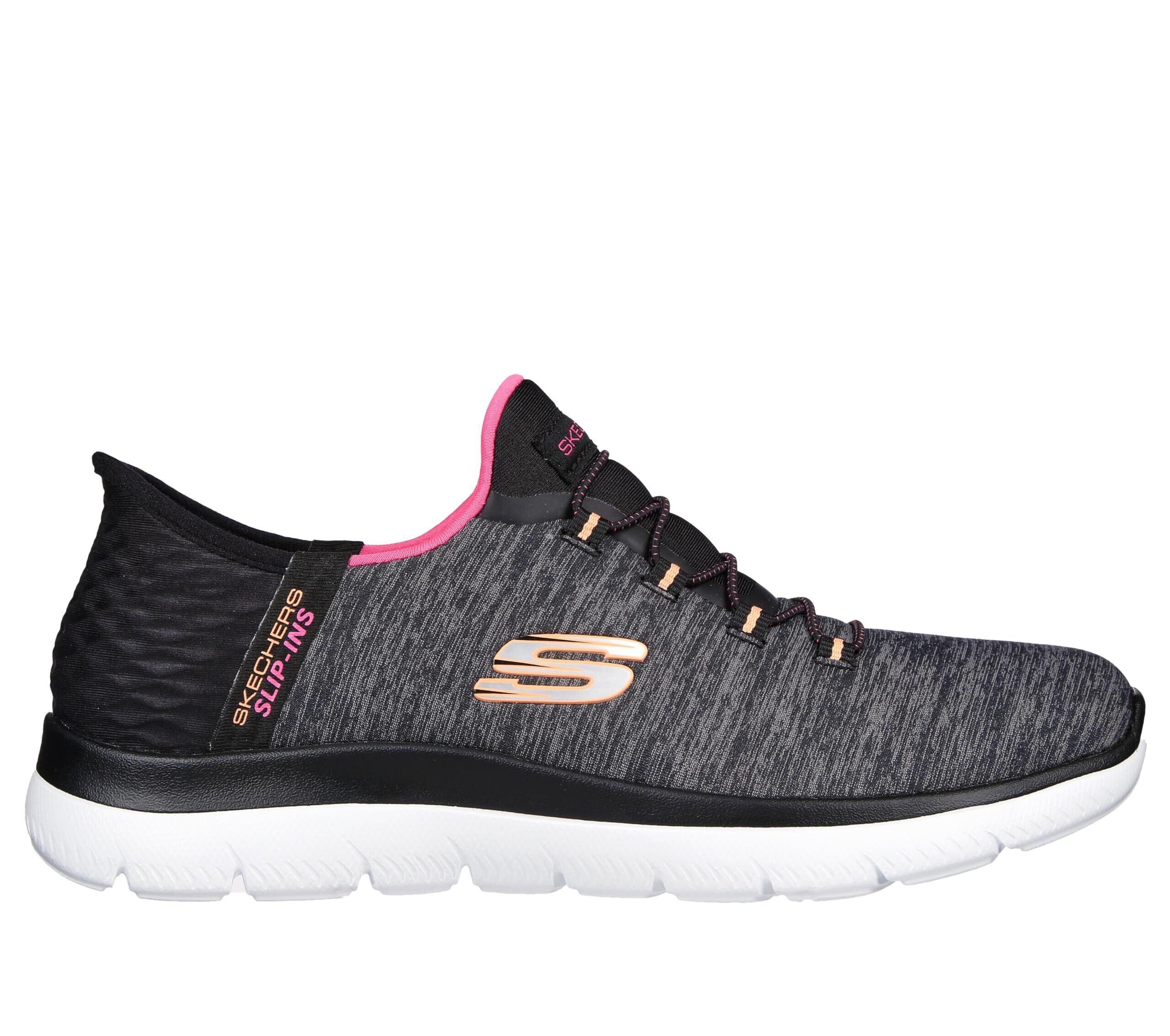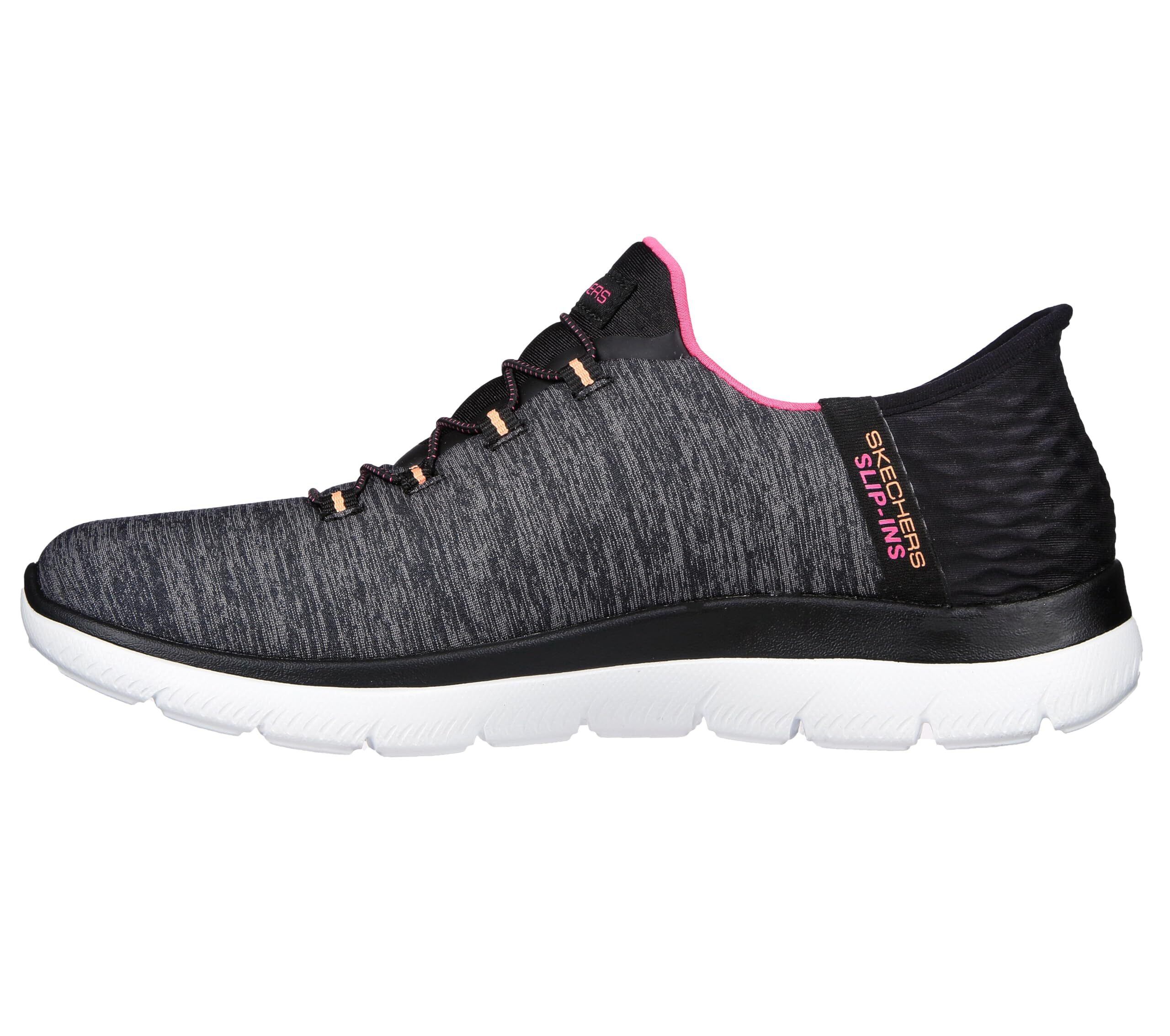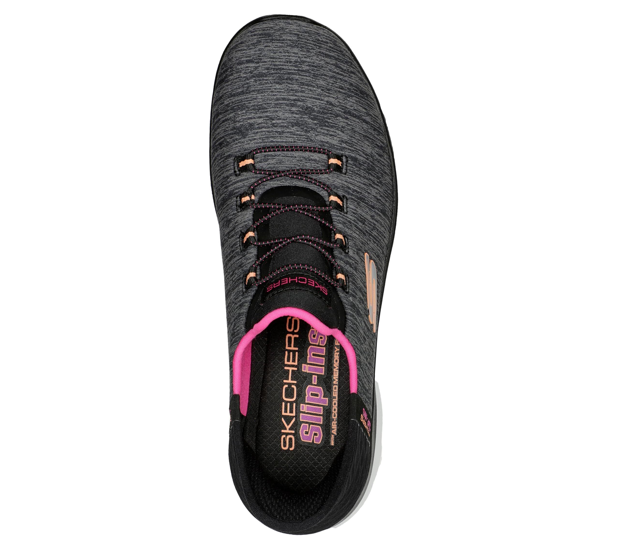 履きやすさと快適な履き心地でペースを上げる、Skechers Slip-ins: Summits - Dazzling Haze スケッチャーズ スリップインズ:サミッツ - ダズリング ヘイズ。独自のヒールピロー;を搭載したヴィーガンスタイルの一足です。ソフトなヘザージャージーニットのアッパーと固定ストレッチレースを配し、クッション性のあるSkechers Air-Cooled Memory Foam(スケッチャーズ エアクールドメモリーフォーム)のコンフォートインソールを組み合わせました。