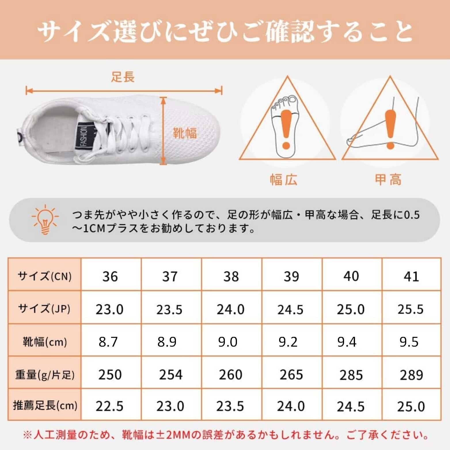 【1.0cm大きめをお勧め】つま先や幅がやや小さく作るので、足囲C以上の方、普段のサイズよりワンサイズ上をお勧めしております。足の形が幅広・甲高な場合は2サイズ大きめをお勧めしております。