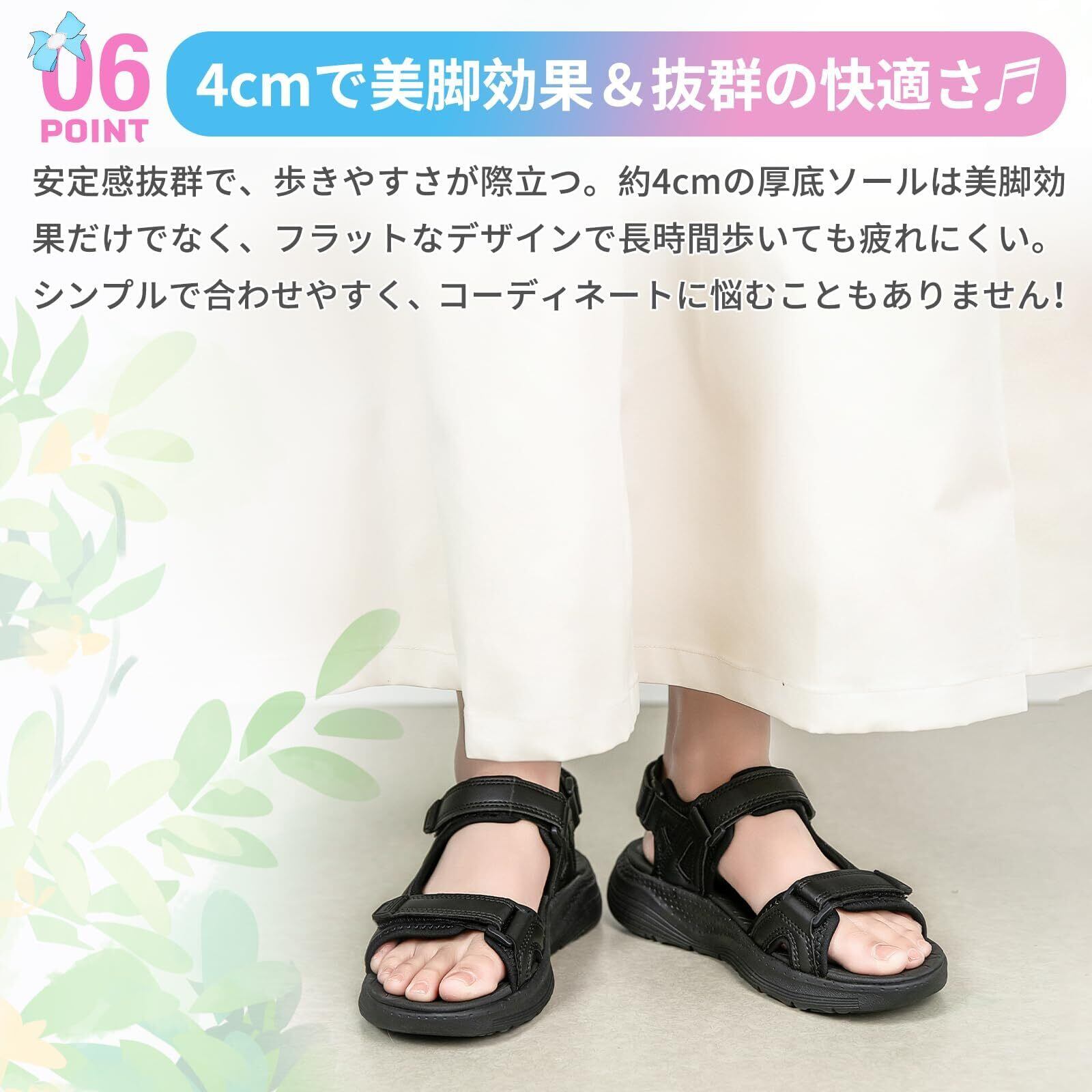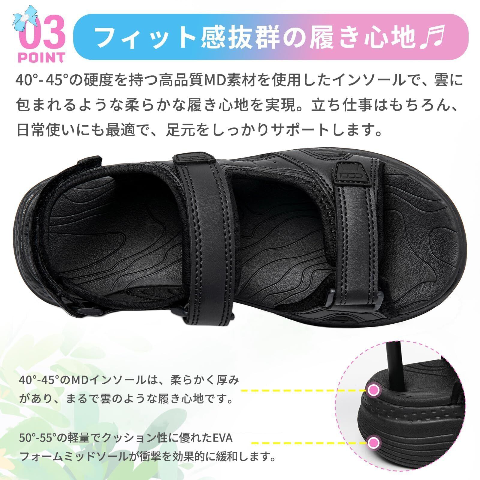 【真夏を快適に過ごす為のレディースサンダル】フットベッドには快適なフィット感のソフトなEVAフットベッドを使用。中央が少しカーブした立体的なソールなので、足裏にフィットします。踵部分がゴム仕様なのでちょっと脱ぎたい時も便利。