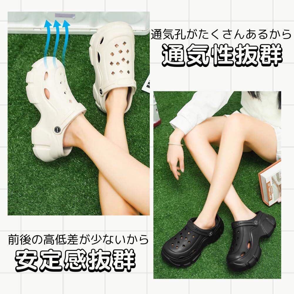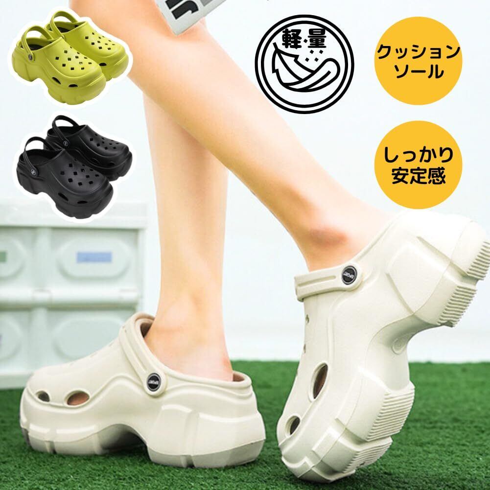 【特徴】通気性抜群:穴があいているデザインなので、蒸れ知らず。暑い日でも快適に過ごせます。 軽量で持ち運びやすい:超軽量のEVA素材を使用しているので、持ち運びにも便利です。 厚底プラットフォームヒール:ヒールの高さは最大6cmで、スタイルアップ効果も期待できます。安定感があり歩きやすく、美脚・脚長効果も期待できます。 シンプルなデザイン:旬のディテールをさり気なく取り入れた、シンプルなデザイン。どんなシーンにも合わせやすいです。