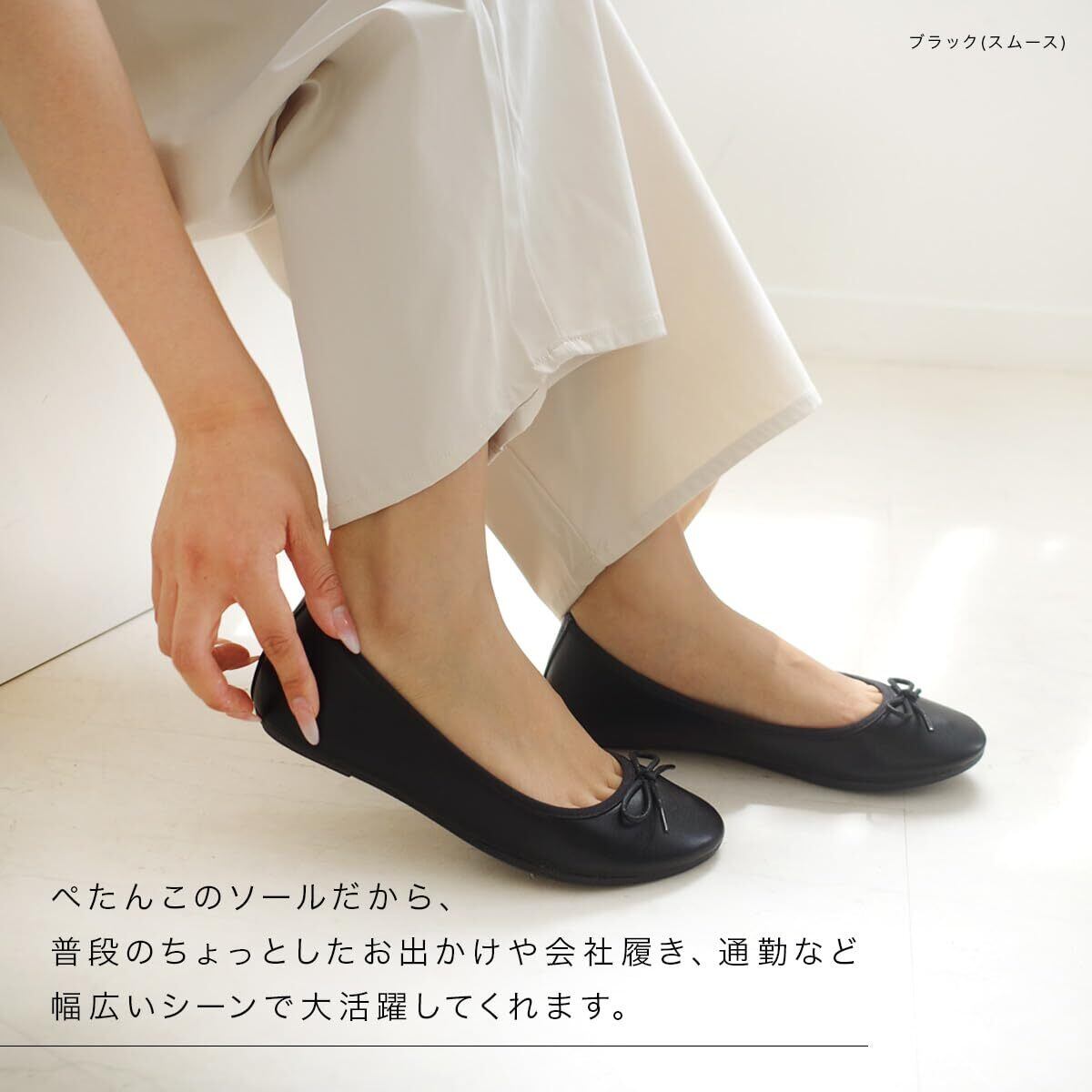デイリー使いにも是非オススメな楽ちんパンプス!柔らか素材で履き心地良く、ぺたんこソールなのに大人可愛い! コロンと丸いつま先に、ちょこんと品良くついたリボンは大人の女性でも取り入れやすい媚びない愛らしさ!!