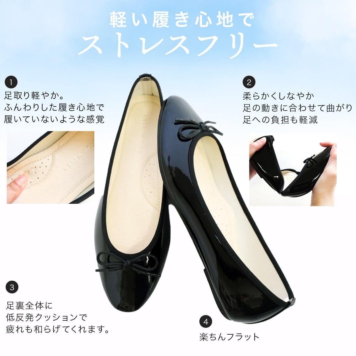 上品クラシカルなスクエアトゥで大人っぽくきれいめに履ける! 軽くて足裏全面ふかふかな低反発クッションで疲れにくい! 楽ちんぺたんこバレエシューズは、オールシーズン大活躍の、色違いでそろえたいアイテムです。