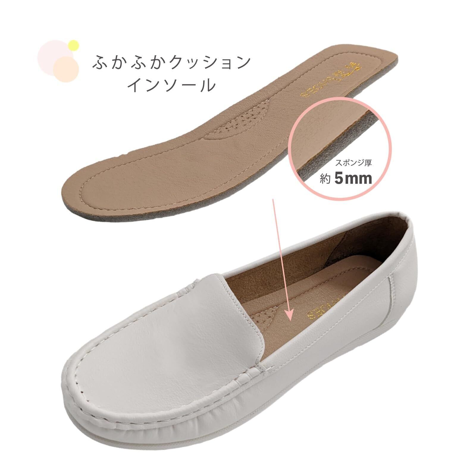 レディースモカシンシューズは約5mm厚のふわふわクッションインソールを使用。安定感のある約2.5cmのフラットソールで 履き心地、安定感抜群です。アウトソールは屈曲性もよく、超軽量片足約150gだから軽やかに履けるモカシンシューズです。