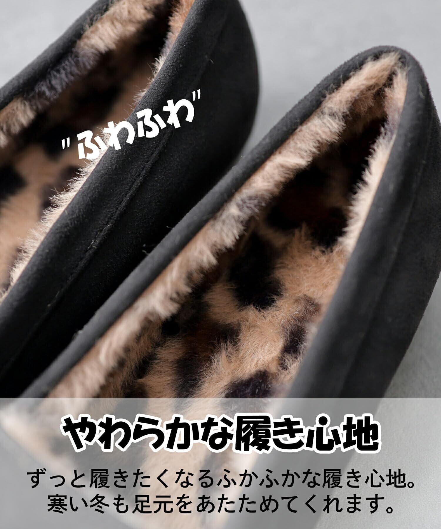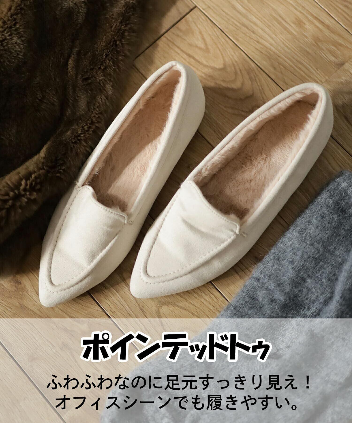 【秋冬に最適な暖かさと快適な履き心地】内側にふわふわのファーを使用し、寒い季節でも足元をしっかり保温。フラットシューズながらカジュアルになりすぎず、履き心地とスタイリッシュさを両立。