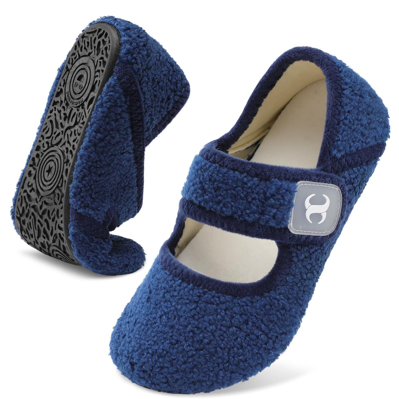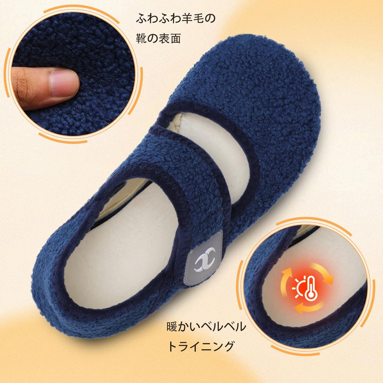 調節可能な幅広モカシンスリッパ:面ファスナーでどんな足の形にもぴったりフィットし、圧迫感もありません。つま先が自然に広がる幅広デザインで、外反母趾、魚の目、たこといった足のトラブルを軽減し、より健康な足へと導きます。