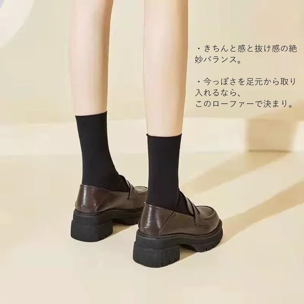 スニーカーも良いですけれど、雰囲気がガラッと変わるのでオススメのアイテム。 今季のスタイルにはずせない厚底ソールがポイント